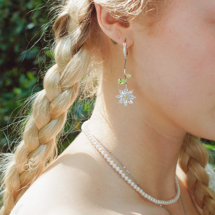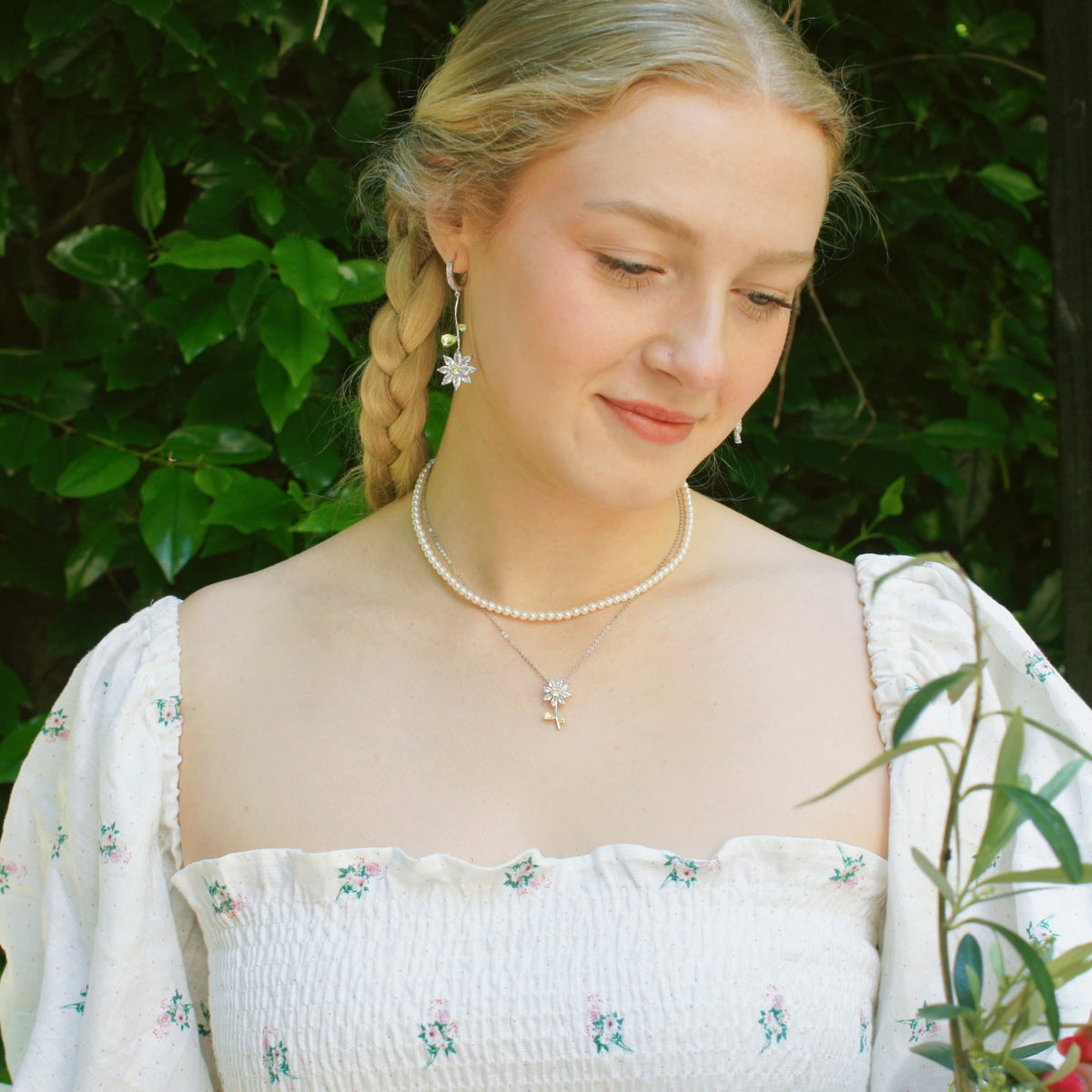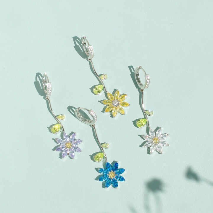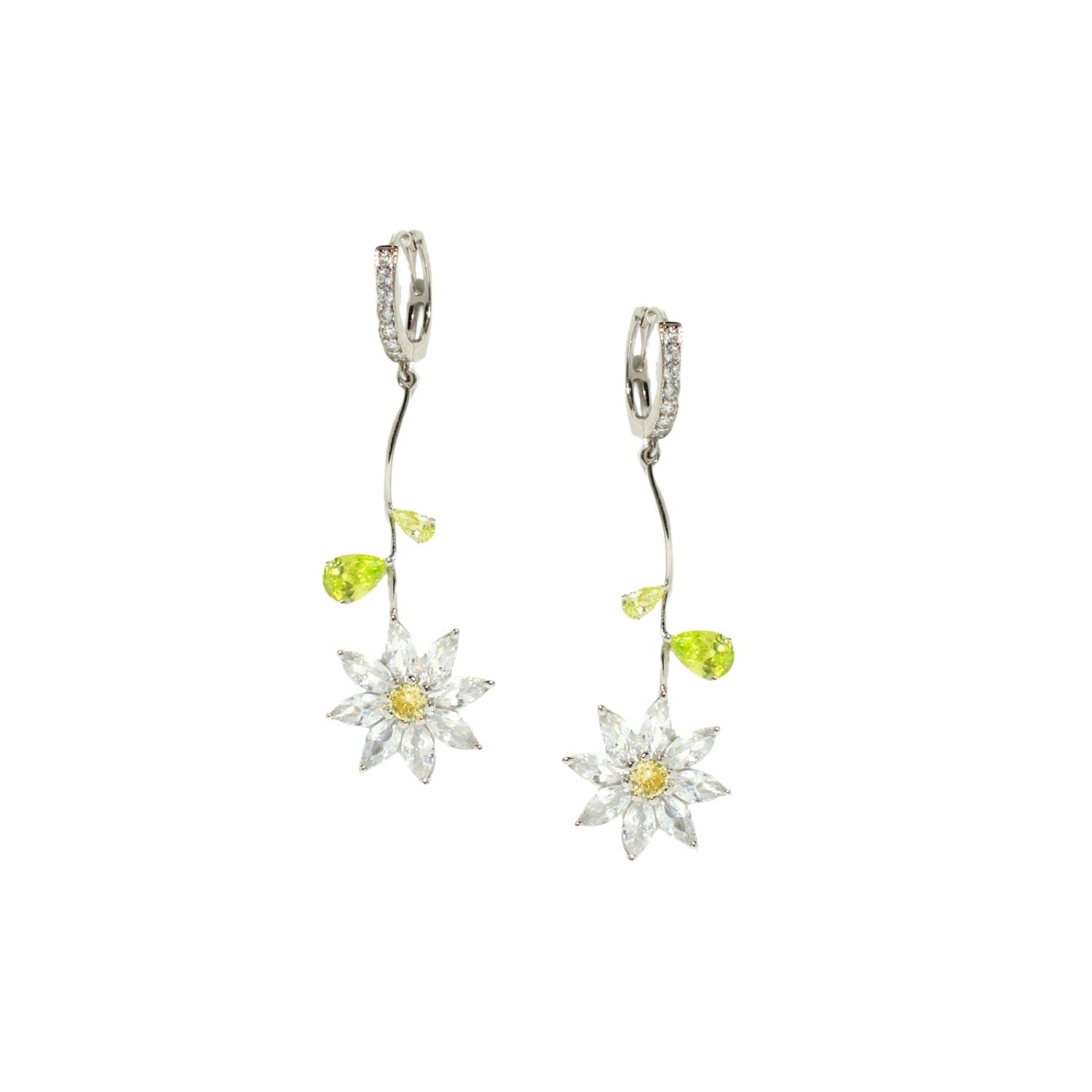 These drop earrings are crafted from solid sterling silver and feature a sparkling crystal pave huggie hoop with a daisy drop.