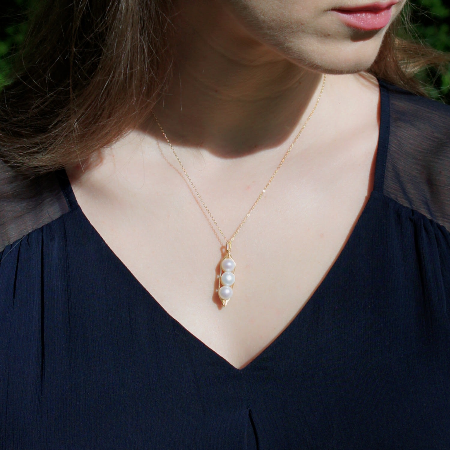 This Garden Peas Necklace Freshwater Pearl by I'mmany London is a charming and whimsical tribute to a grandmother's garden. Handcrafted to emulate sweet peas in a pod, this necklace features shimmering freshwater pearls on a fine gold vermeil chain. It adds a touch of playful elegance and nostalgic sweetness to any spring or summer look.