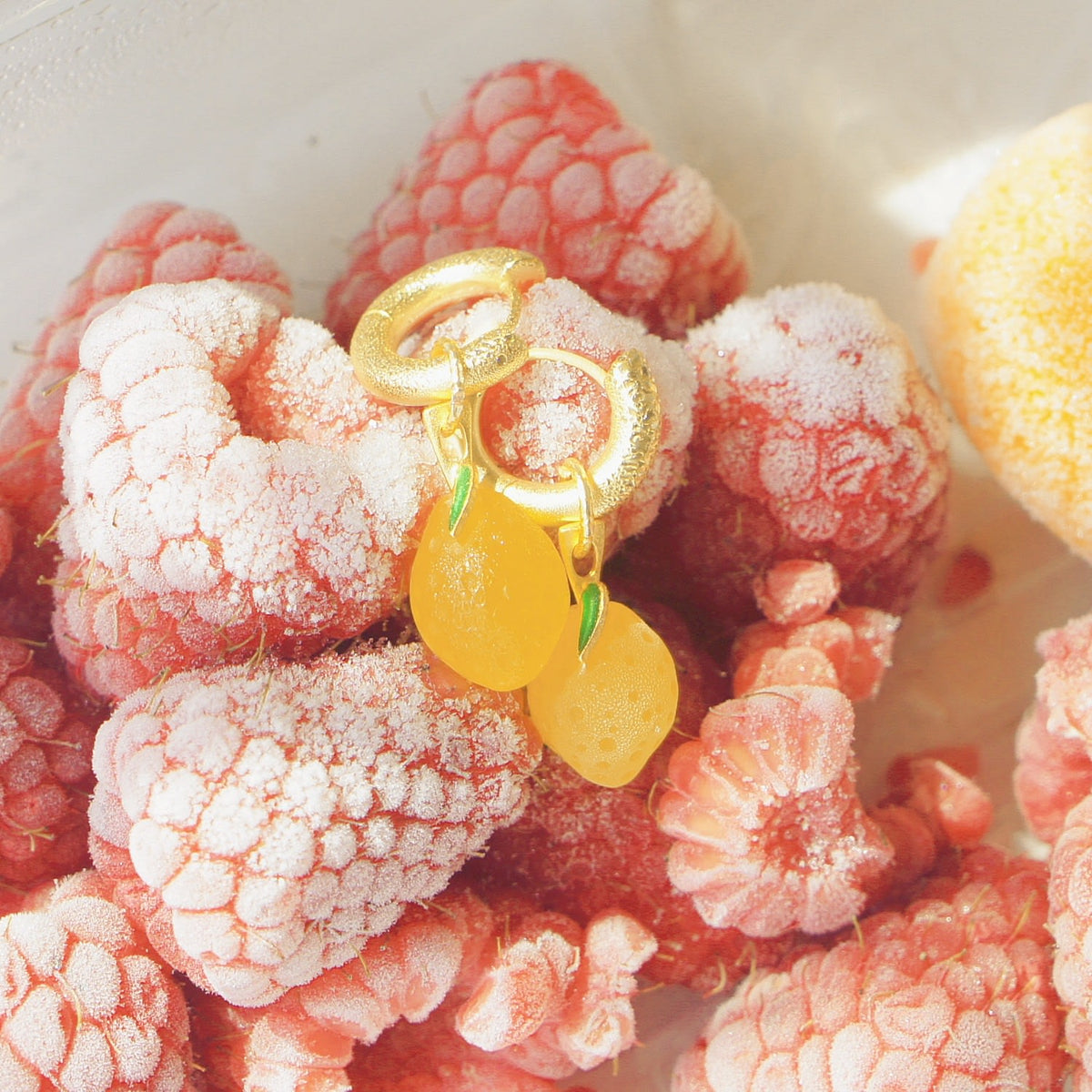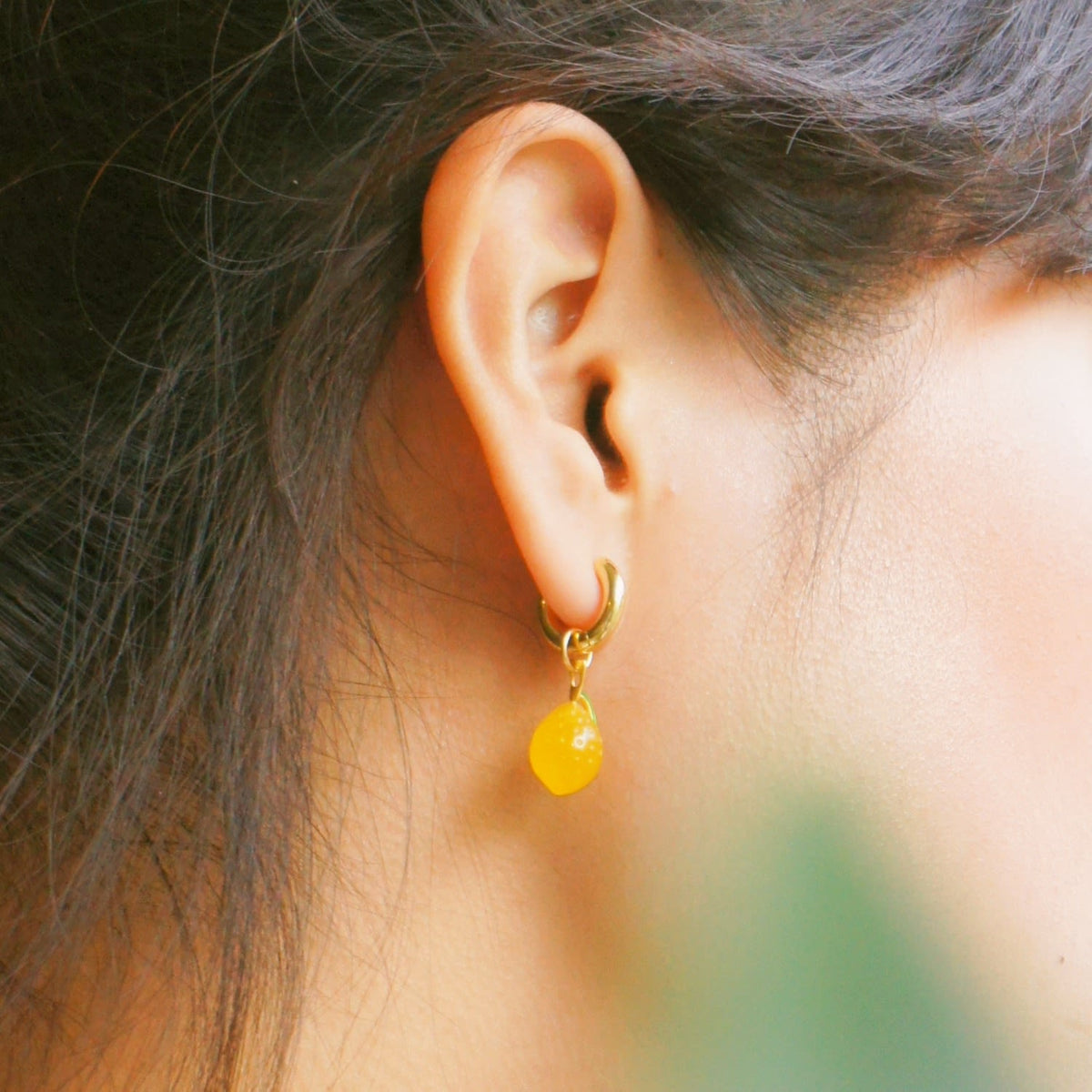 These Organic Fruit & Pearl Asymmetrical Hoop Earrings, 18K Gold Vermeil, Jade Lemon by I'mmany London are a whimsical yet elegant accessory. Each handcrafted earring features a carved yellow jade lemon and gold-tone and enamel leaves dangling from a chunky gold hoop. The asymmetrical design adds a fun and modern twist, making them a perfect statement piece.