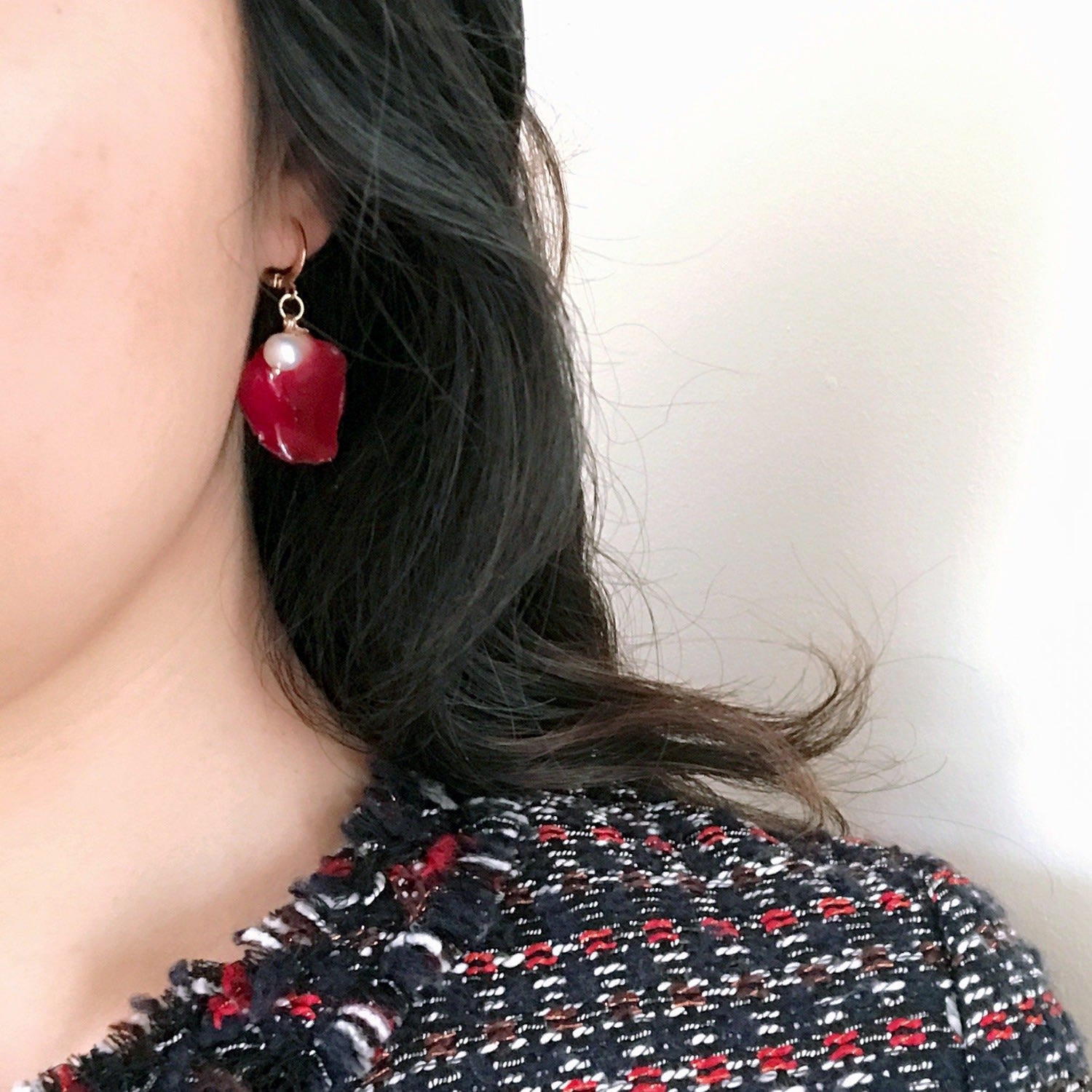 These handcrafted huggie hoop earrings are made from real, resin-coated rose petals, freshwater pearls, and triple electro gold-plated brass.