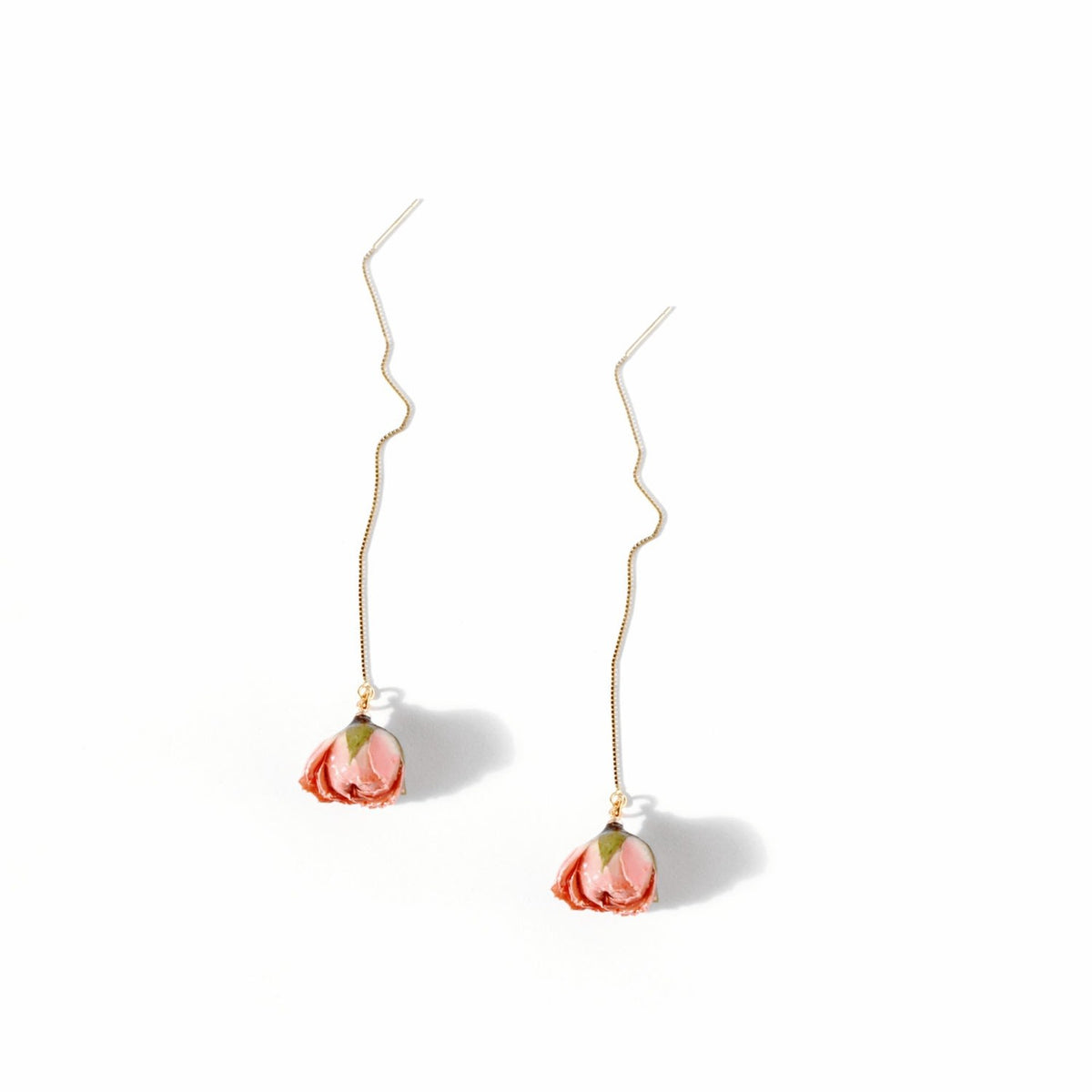 These length-adjustable threader earrings are made from real, resin-coated pink rosebuds and 18k gold vermeil.