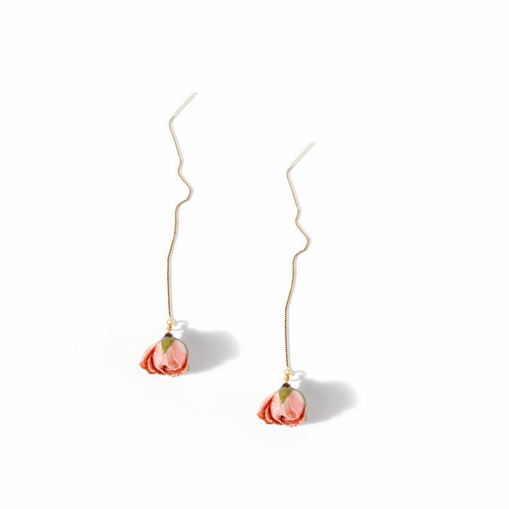 Real Flower Bella Rosa Pink Rosebud 18K Gold Vermeil Threader Earrings
