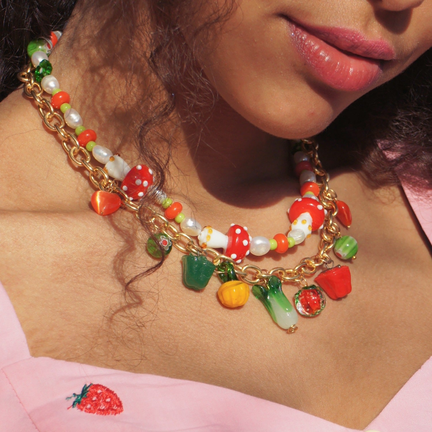 This chain necklace is crafted from glass, coral, and rhodium-plated brass. It features vegetable charms.