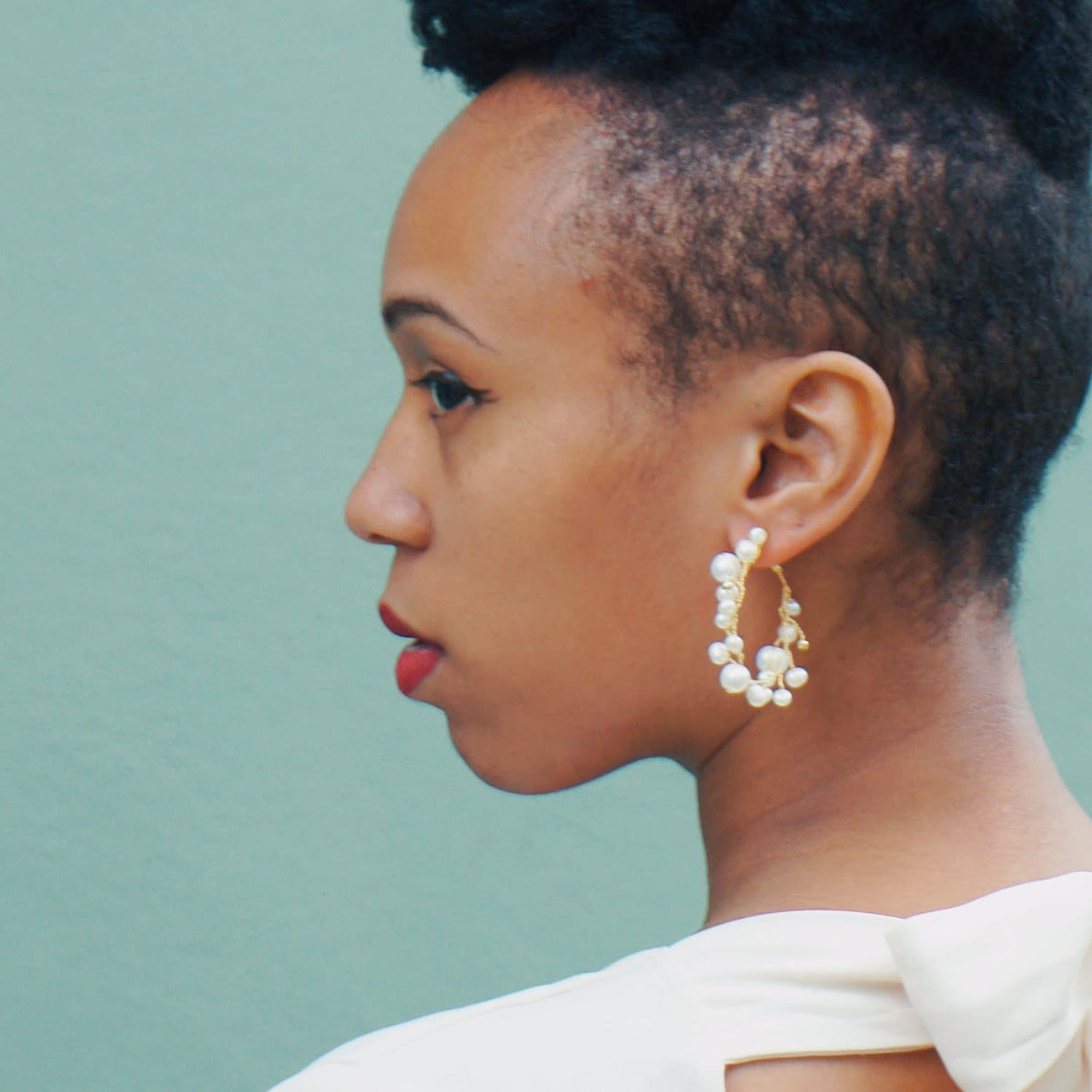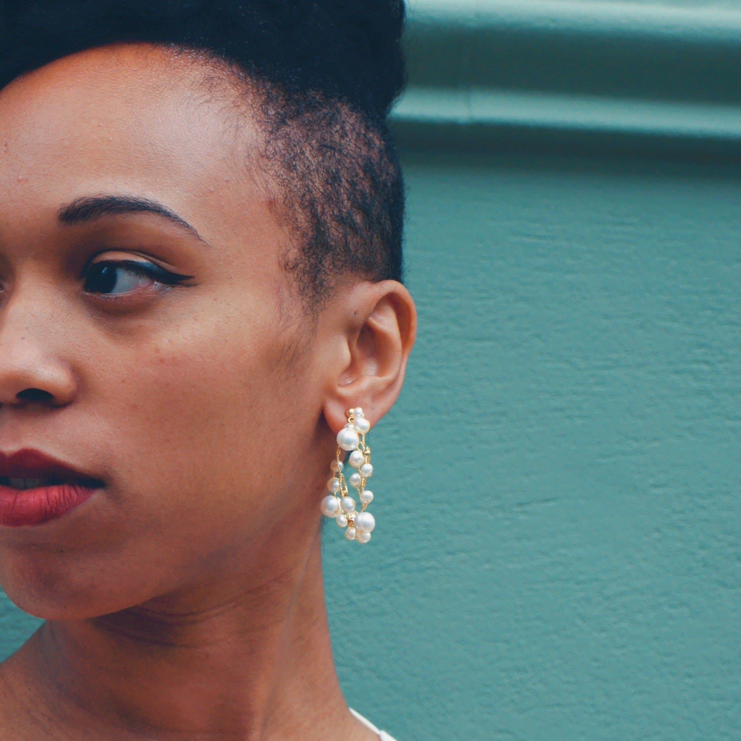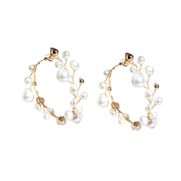 These Soft Rime Freshwater Pearl Hoop Earrings by I'mmany London are a delicate and beautiful accessory. Inspired by snow-covered branches, these handmade hoop earrings feature delicate spokes of gold-plated bronze wire adorned with freshwater pearls of various sizes.