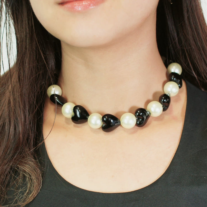 This Whisper Of Heart Glass Heart And Jumbo Pearl Necklace by I'mmany London is a modern and fashion-forward statement piece. The bold ivory faux pearls are strung with a handcrafted opaque black lampwork glass heart, creating a unique and captivating contrast. This necklace symbolizes a modern romance with a hint of dramatic flair, designed to be the centerpiece of your look and make a lasting impression.
