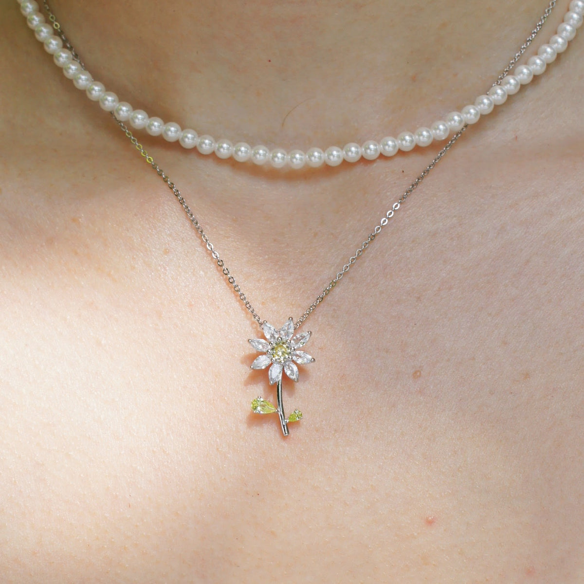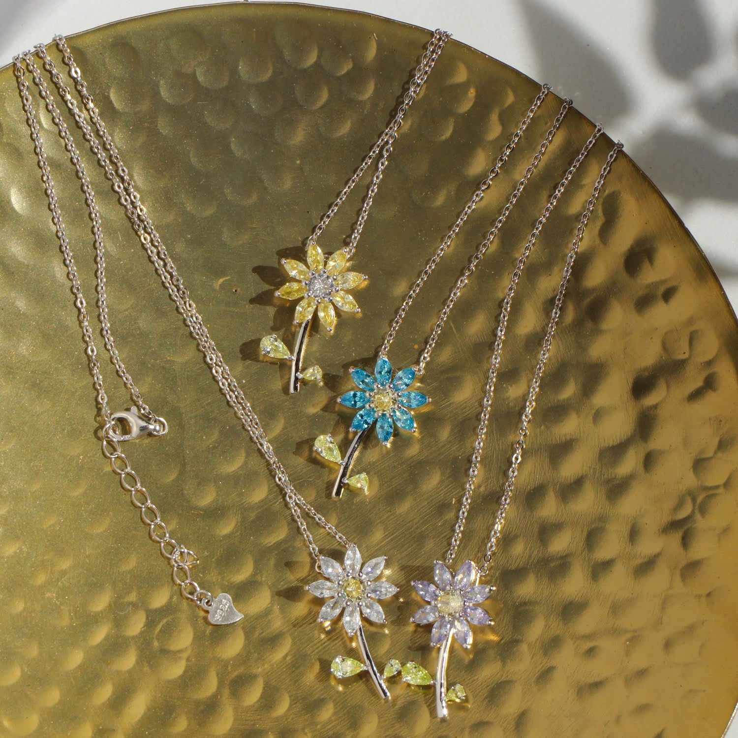 The Garden Tales Crystal Daisy Sterling Silver Pendant Necklace, Lilac by I'mmany London is a timeless and fresh accessory. This daisy pendant necklace, which is crafted in sterling silver and cz crystal, symbolizes innocence, new beginnings, and purity. The daisy is crafted in clear crystal with a shimmer effect and a yellow crystal center on a curved stem with crystal leaves.