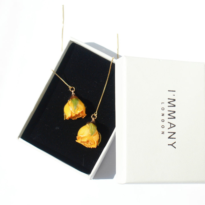 The Rosa Korresia Yellow Rosebud 18K Gold Vermeil Threader Earrings by I'mmany London are versatile and vibrant. These dangle earrings feature a real dehydrated yellow rosebud coated in resin and set on a thin 18k gold vermeil chain. The length can be adjusted, and each earring is unique due to the natural flower.