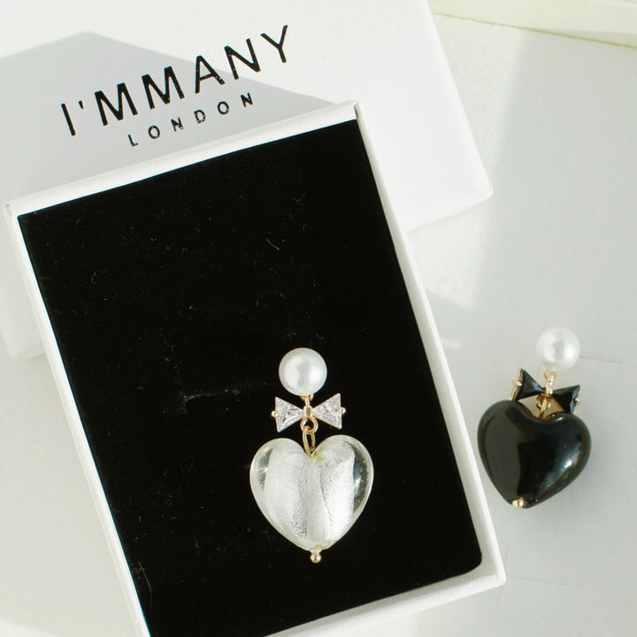The Whisper Of Heart Glass Heart Drop Earrings by I'mmany London are a captivating and elegant accessory. They feature bold lampwork glass hearts that make a statement, while the pearl studs and crystal bows add a touch of refined beauty. They can be styled as a solo pair or layered with other earrings.