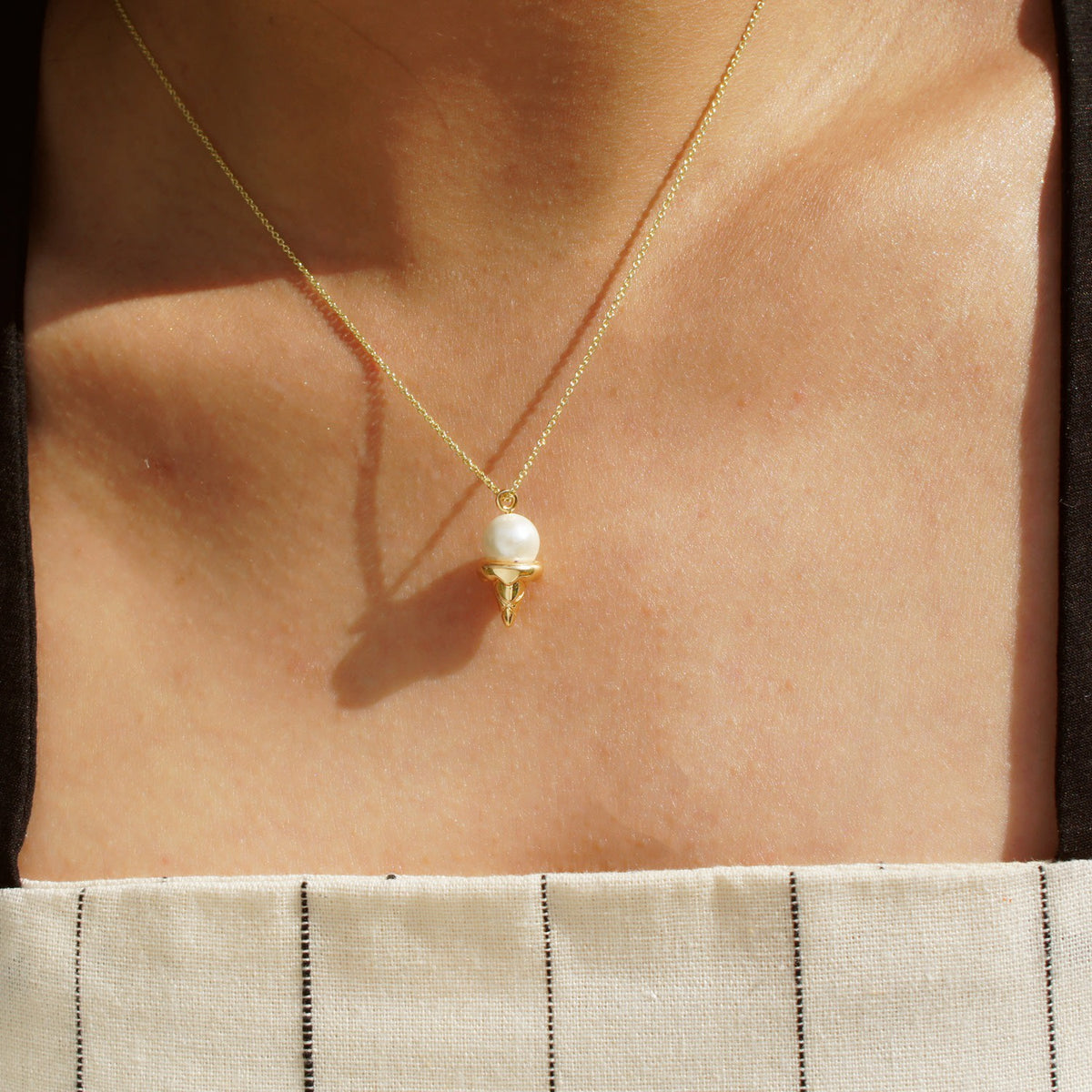 This pendant necklace features a golden ice cream cone and a pearl swirl. The material is not explicitly stated. The product title mentions "pearl."