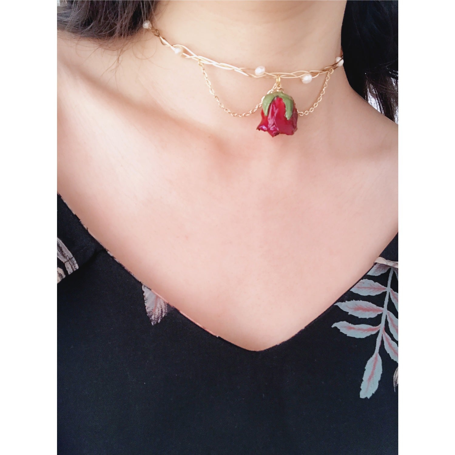 The Grande Amore Rosebud & Pearl Choker Necklace by I'mmany London is a sweet and unique accessory. It features a beautiful red rose suspended from a gold-tone wired pearl choker. This choker effortlessly curves around the neckline, drawing attention to the stunning dried rosebud. It's a special piece that adds a romantic touch to any outfit.