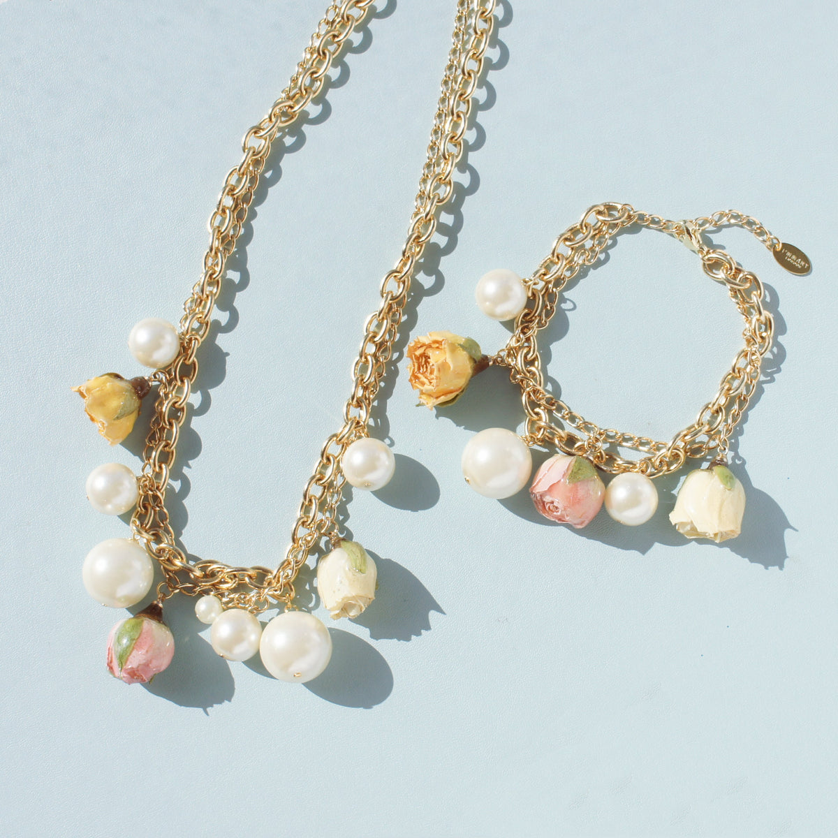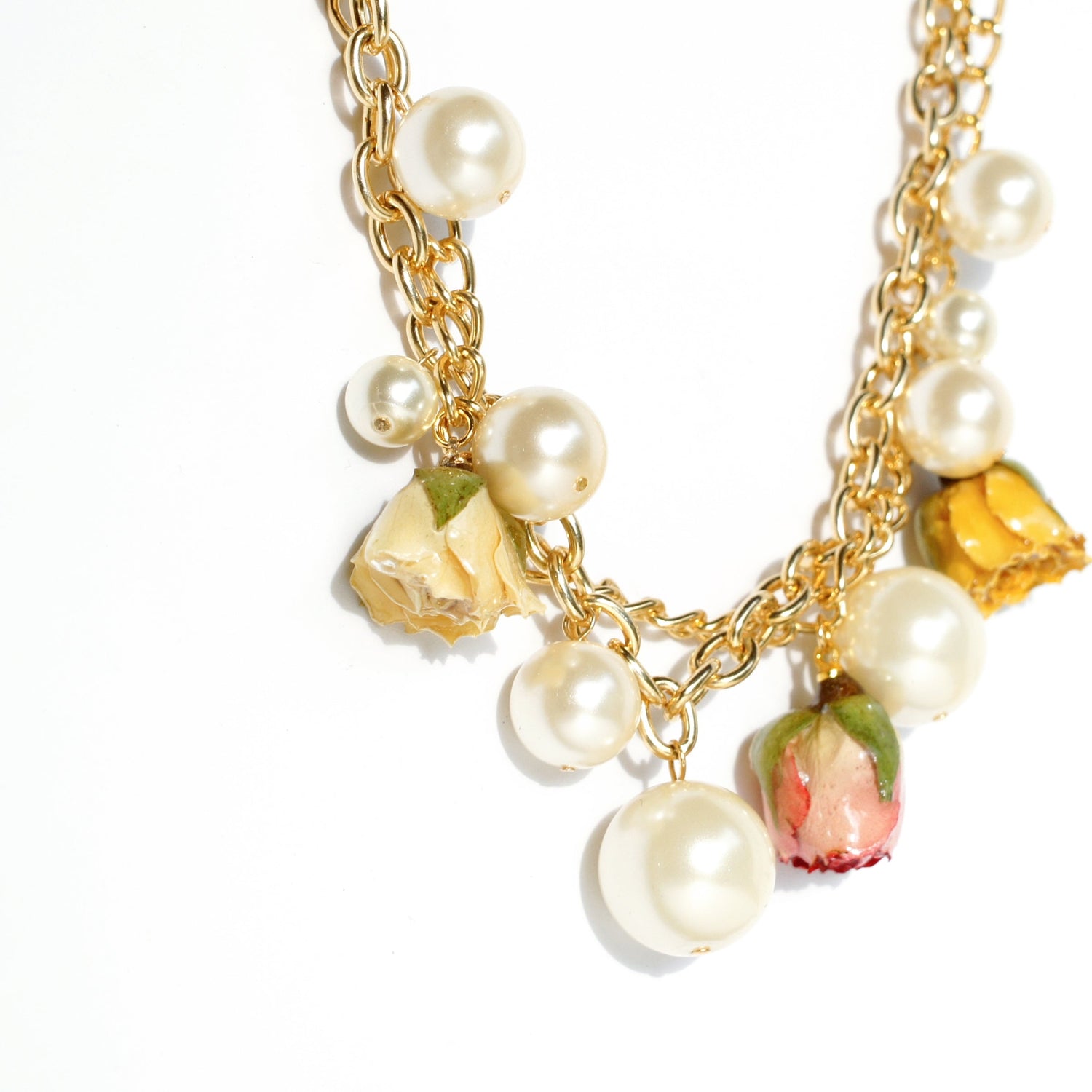 Real Flower Queen Anne Charm Necklace With Real Rosebuds And Pearls