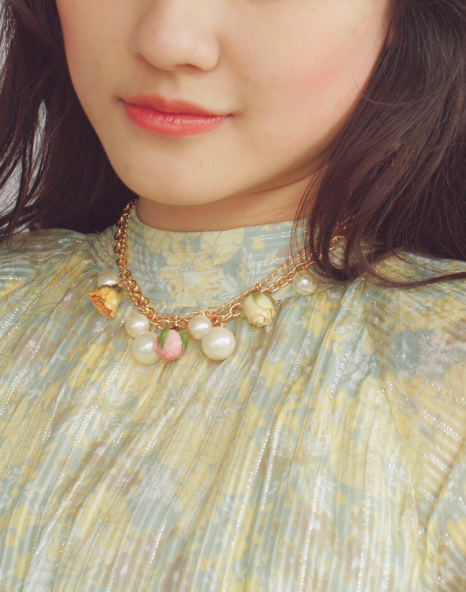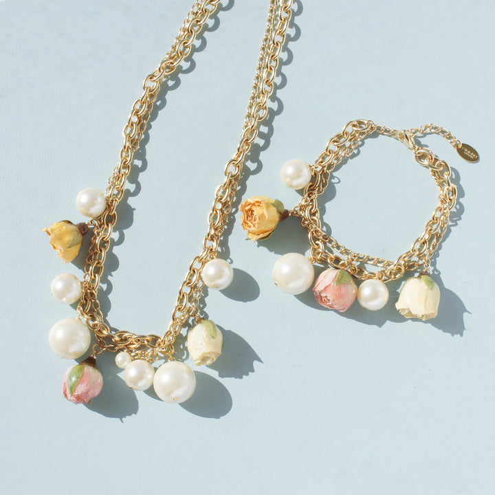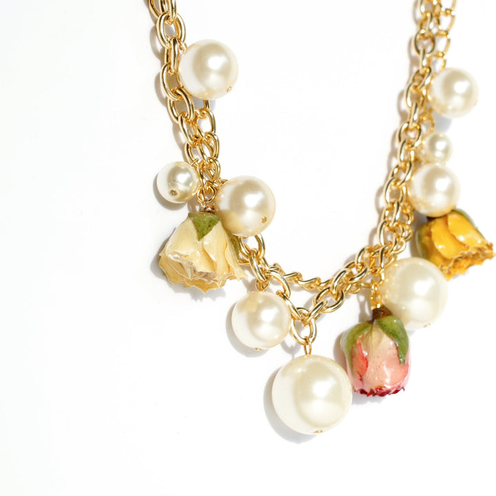 This necklace is handcrafted with glass pearls and 18k gold-plated brass. It features preserved yellow, pink, and cream rosebuds in resin.