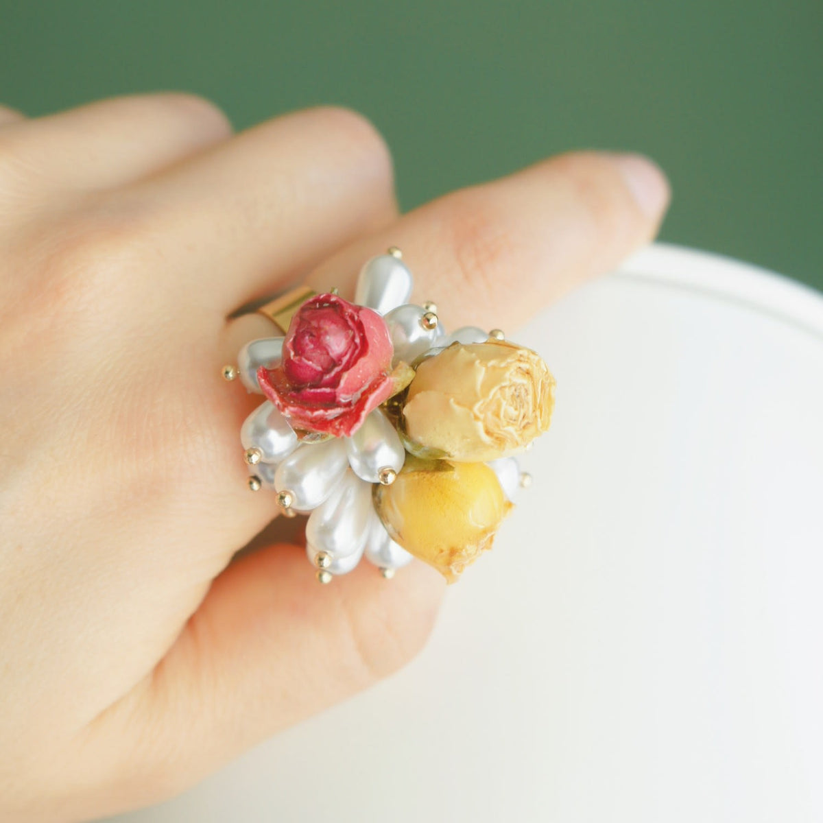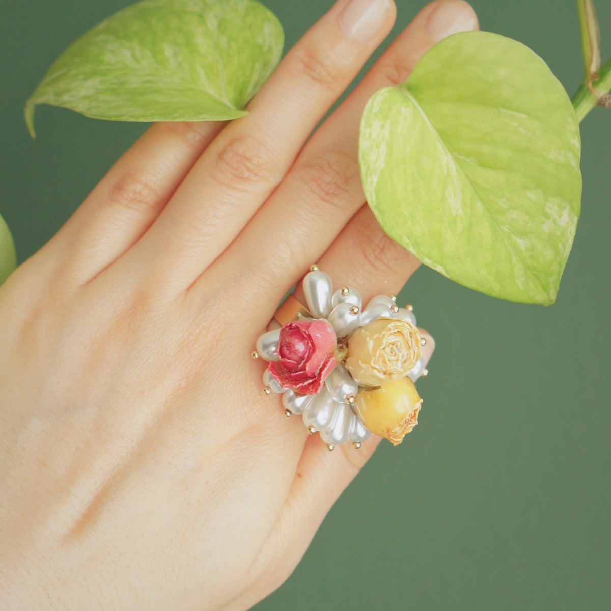 This cocktail ring is made with real, preserved flowers, pearls, and a golden brass open ring. It is adjustable for UK sizes J to R.