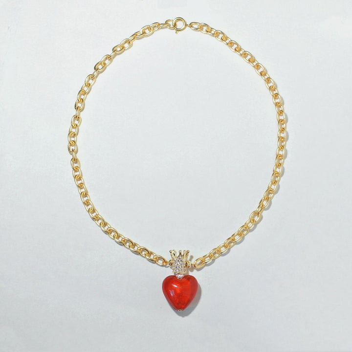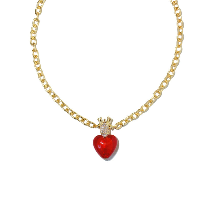 This handmade necklace is crafted from 18k gold-plated brass and features a CZ crystal crown and a glass heart pendant.