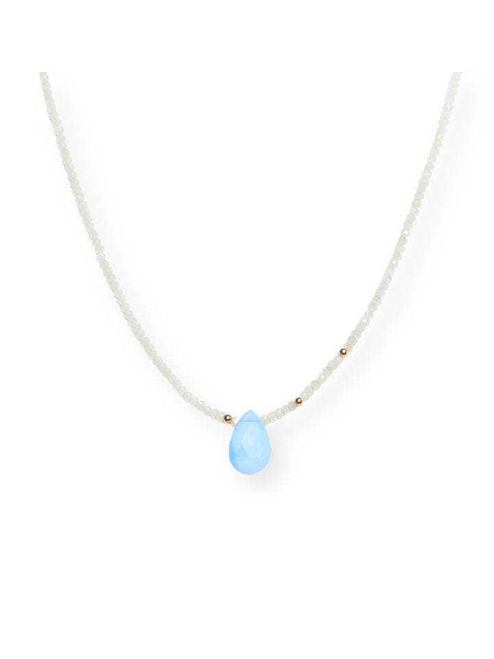 This beaded necklace is made with 14k gold filled materials. It features a Blue Opal teardrop pendant and Prehnite gemstones. The metal is hypoallergenic and tarnish-resistant.