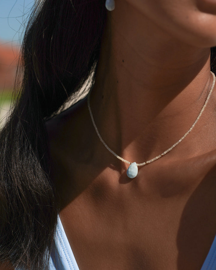 The Bayu Necklace by Inari Jewellery is a minimalist and calming accessory. Inspired by clear tropical waters, it features a luminous blue opal teardrop pendant centered on a strand of Prehnite beads and delicate gold-filled accents. This necklace is designed to evoke soft tides and gentle air.