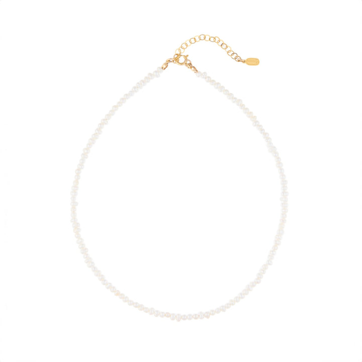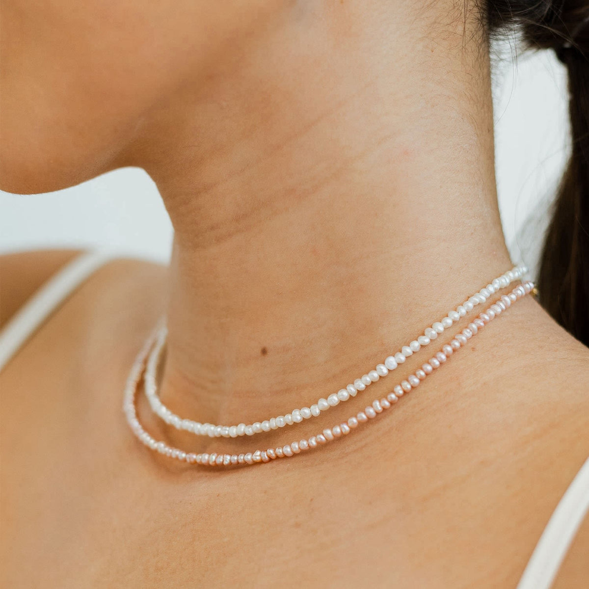 This necklace is handmade with 14k gold-filled findings and cultured freshwater pearls that are approximately 2.5-3 mm in size.