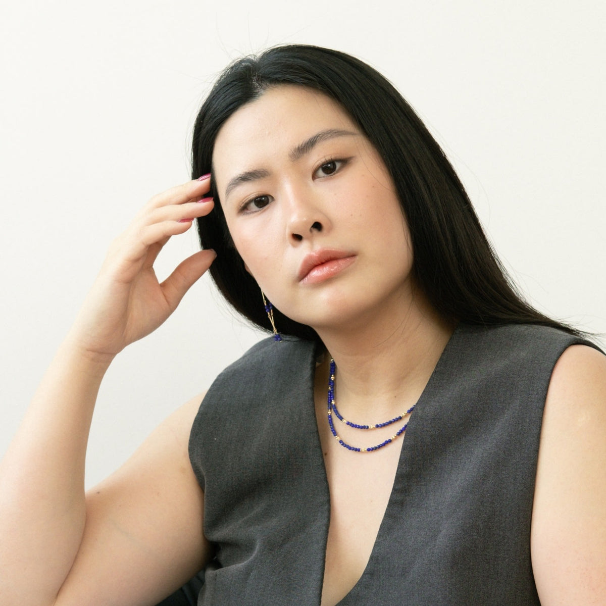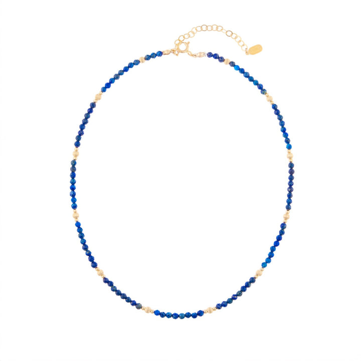 This necklace is made with 14k gold-filled beads and 3mm semi-precious lapis lazuli gemstone beads. It is hypoallergenic and tarnish-resistant.
