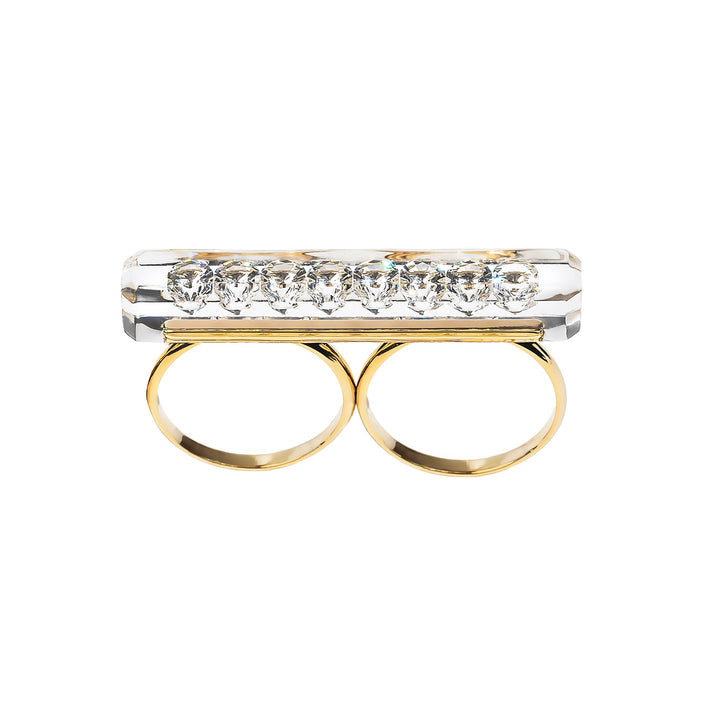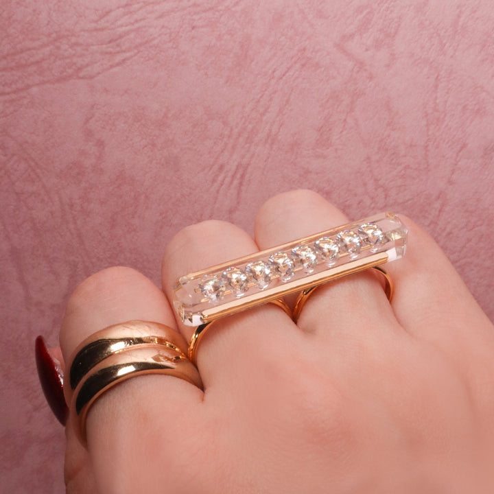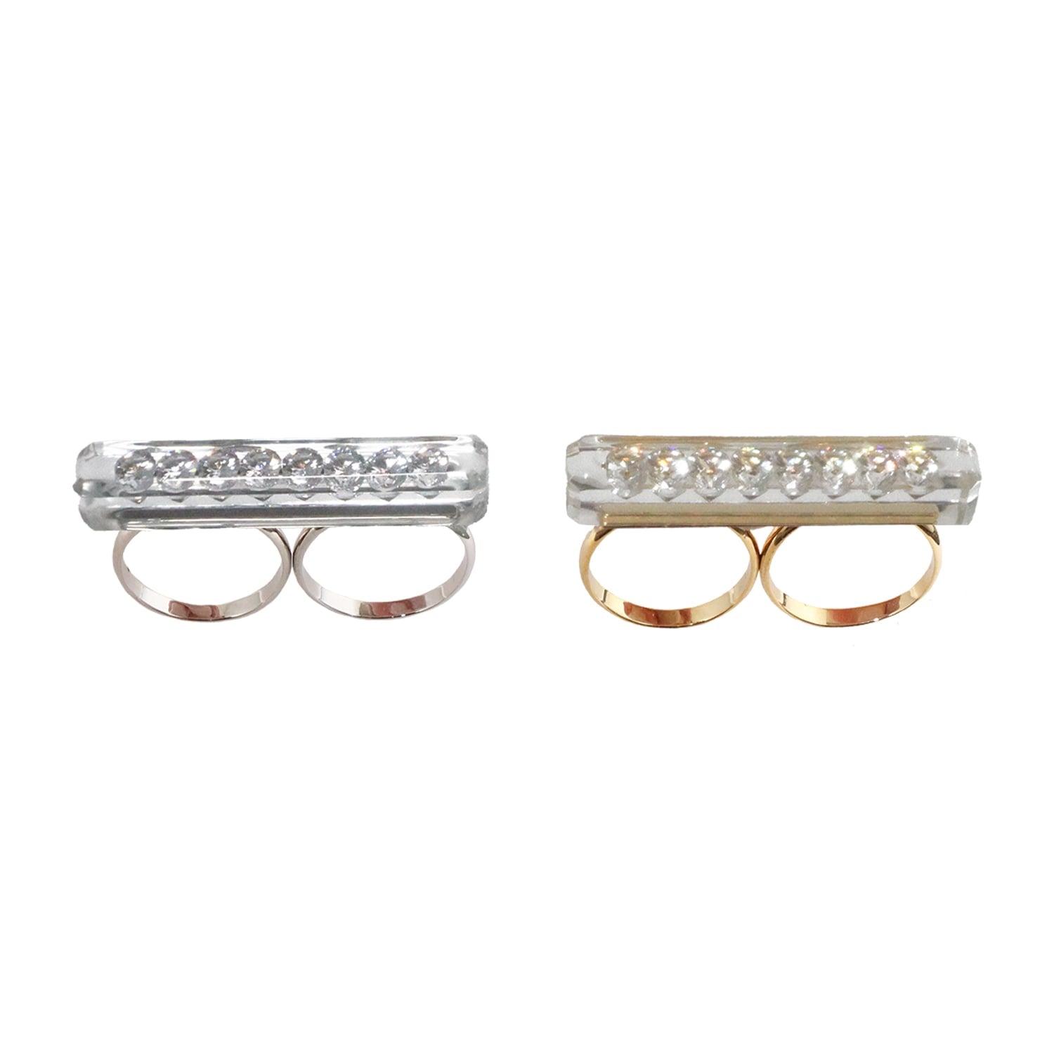This handcrafted double ring is made from epoxy resin, brass, and features eight 4mm clear zirconia stones. It uses nickel-free plating. This ring is available in Japanese sizes 11&12 and 13&14.