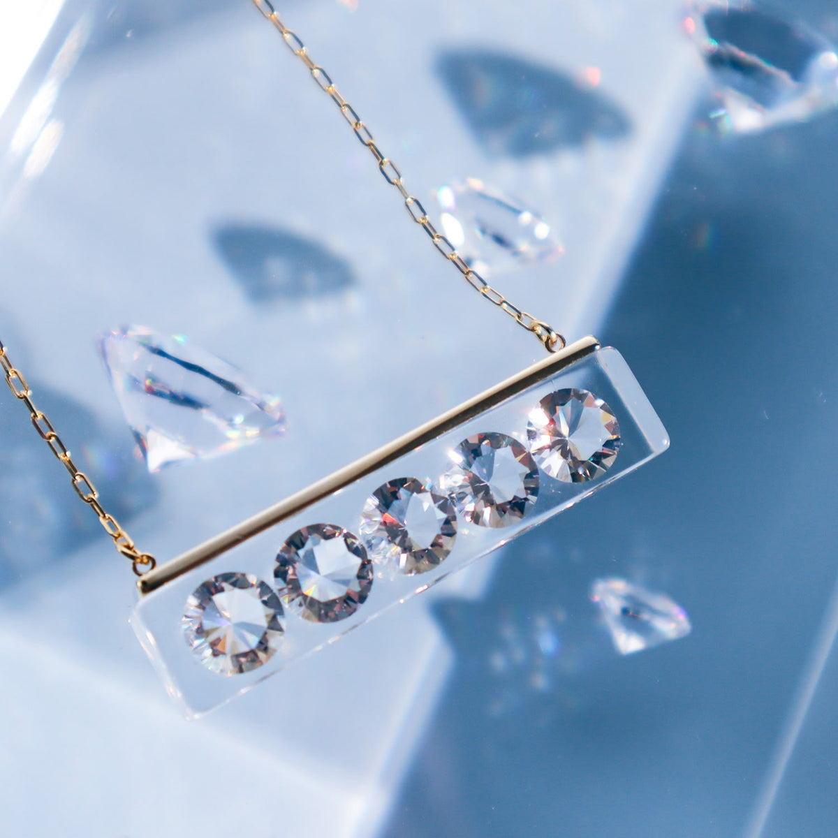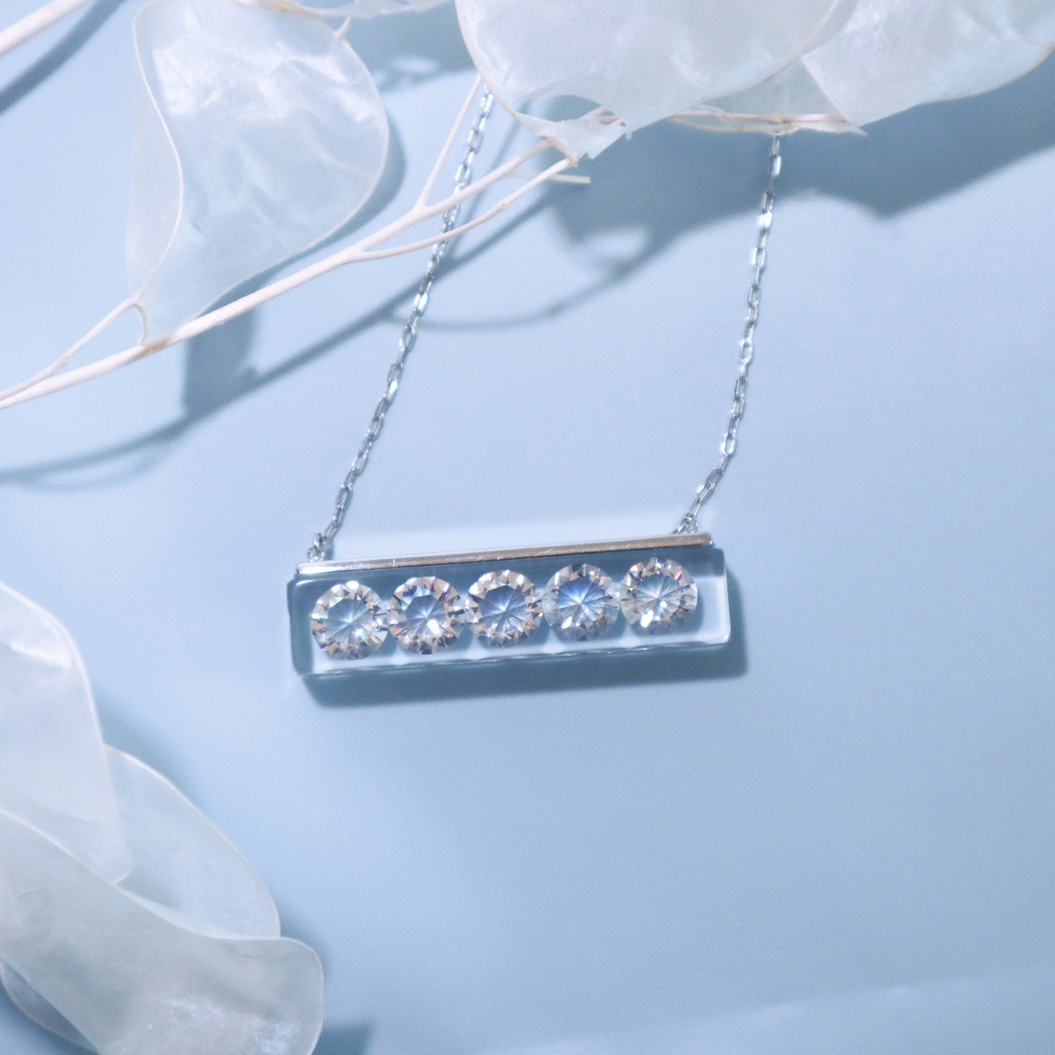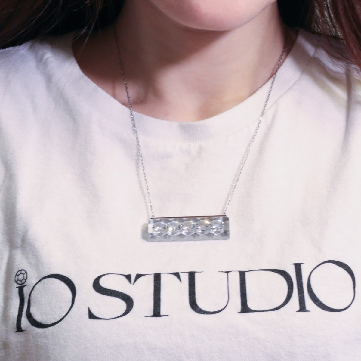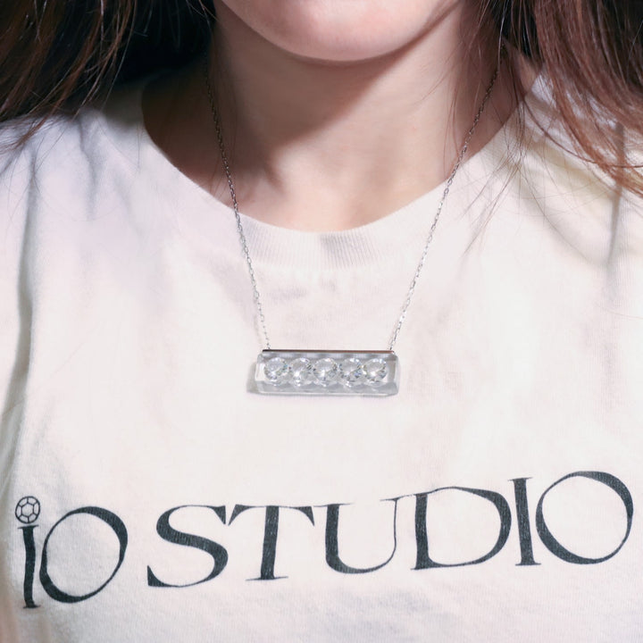 This Five Dreams Necklace by Iostudio symbolizes hope and adds a touch of subtle color to your daily life. The simple yet elegant design features five clear, 8mm stones on a fine box-shaped chain, creating a sophisticated and timeless look. Crafted with meticulous Japanese craftsmanship, this necklace is both trendy and classic. It is a versatile accessory that beautifully disperses light and can be styled with anything from a casual t-shirt to a classic black dress.