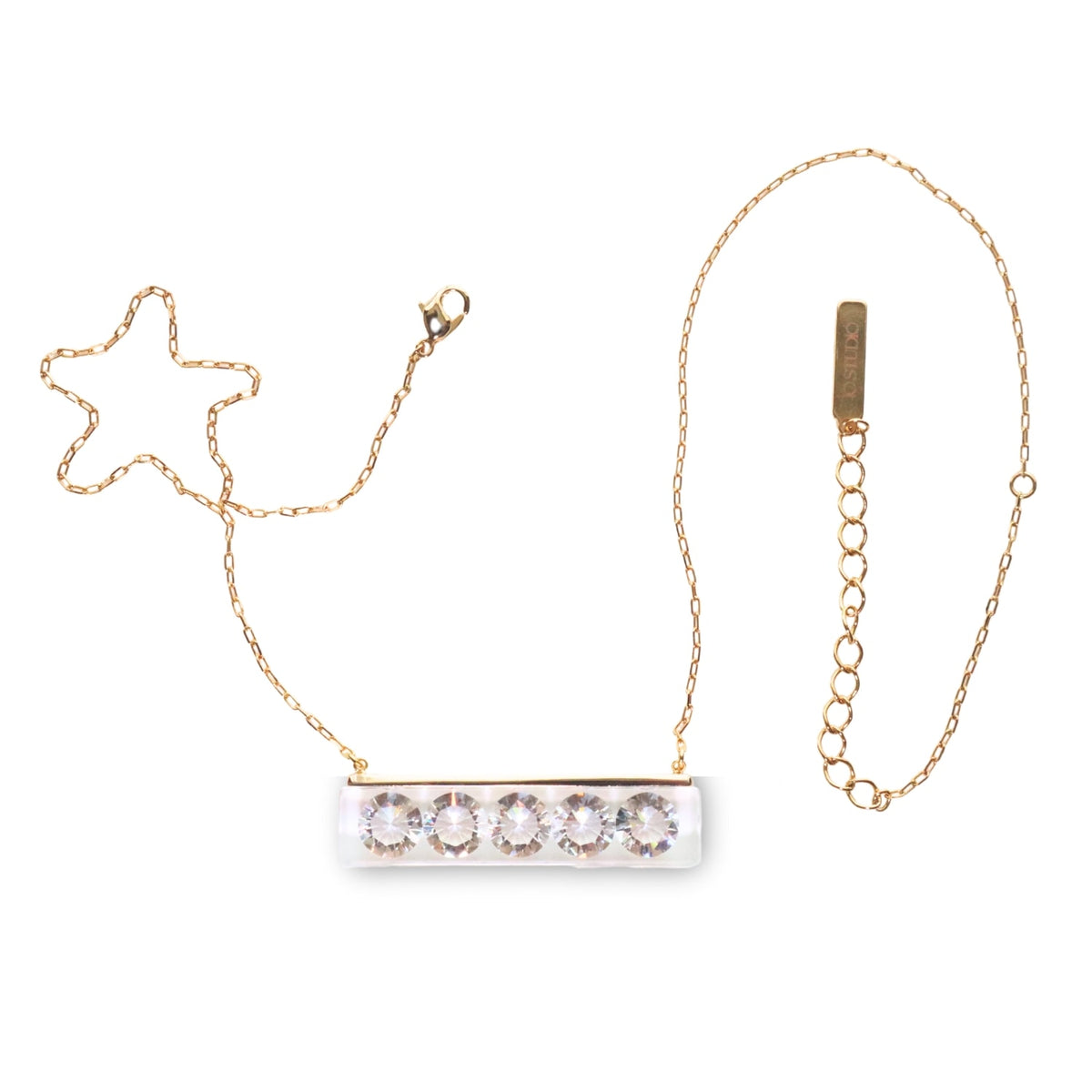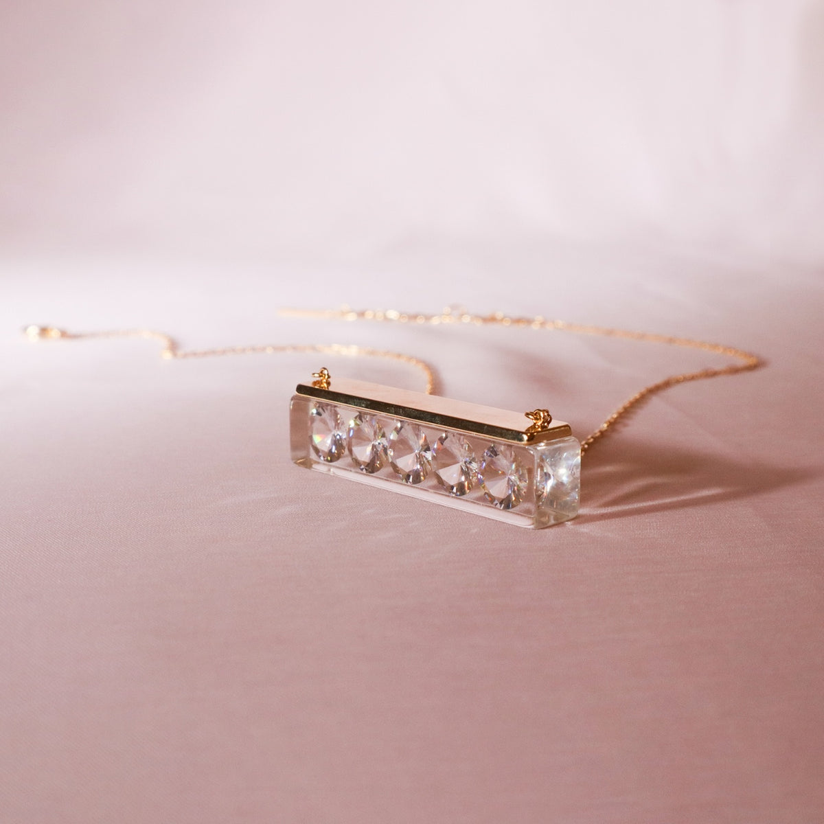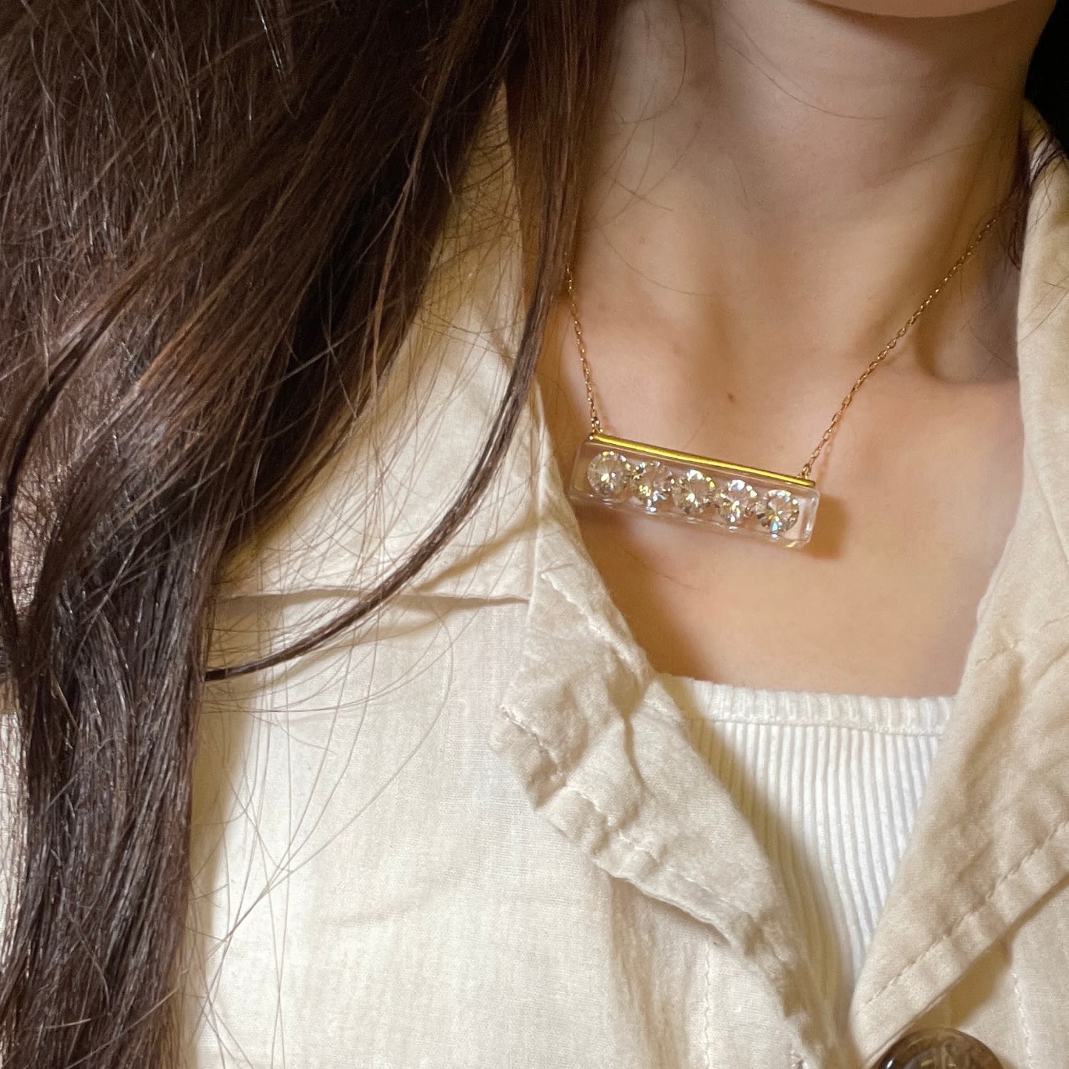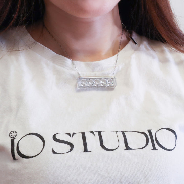 This Five Dreams Necklace by Iostudio symbolizes hope and adds a touch of subtle color to your daily life. The simple yet elegant design features five clear, 8mm stones on a fine box-shaped chain, creating a sophisticated and timeless look. Crafted with meticulous Japanese craftsmanship, this necklace is both trendy and classic. It is a versatile accessory that beautifully disperses light and can be styled with anything from a casual t-shirt to a classic black dress.
