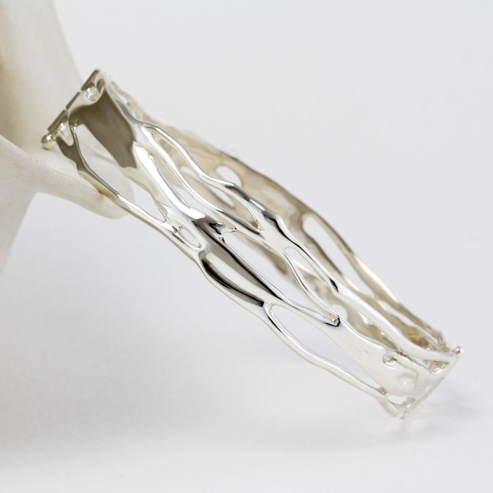 This cuff bangle is handcrafted from Sterling Silver. It is a slim, open cuff with a flowing shape.