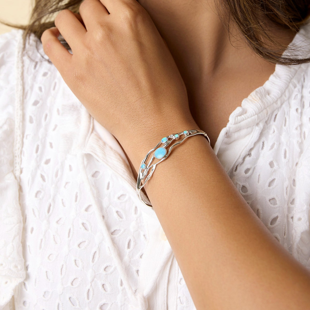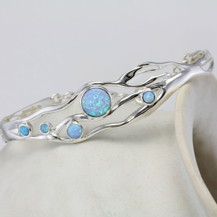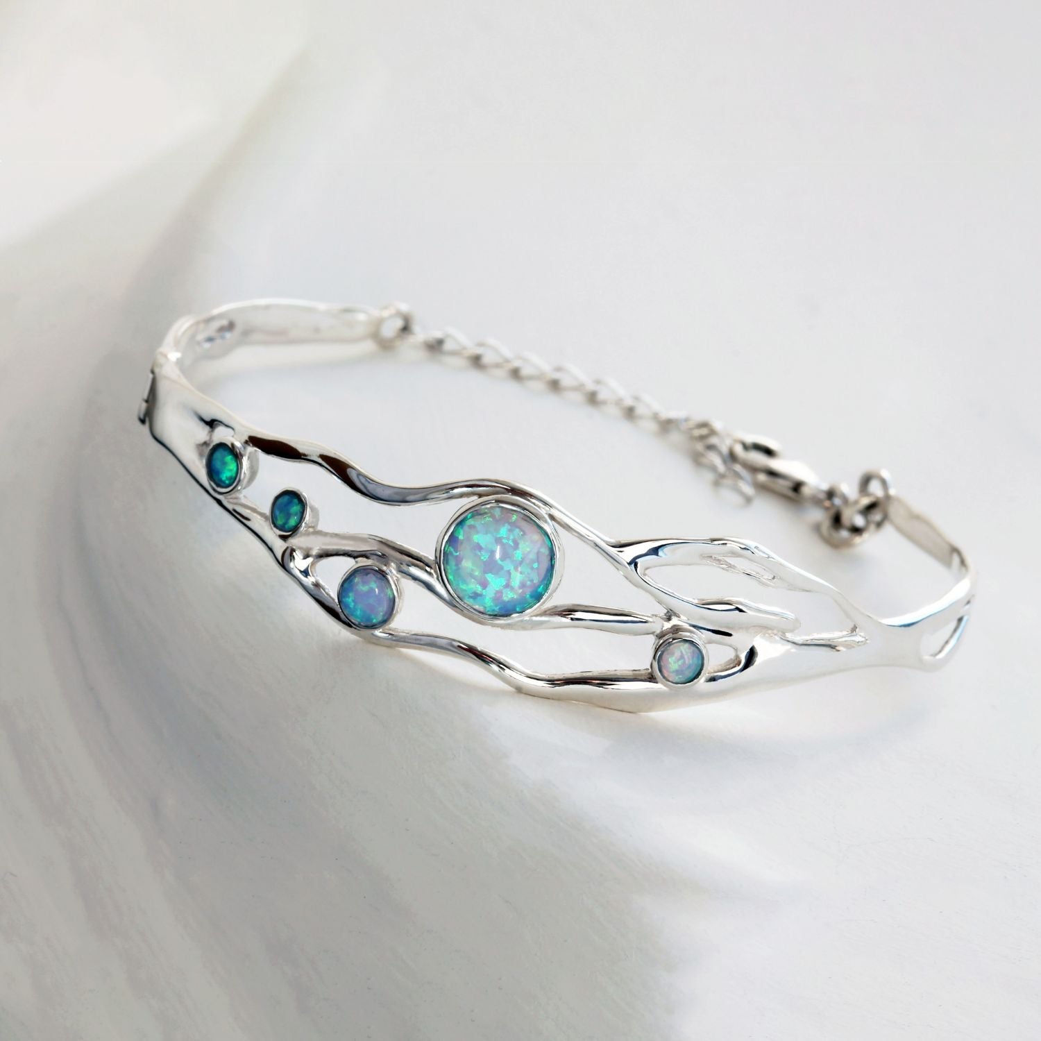 The Handmade Silver Blue Fire Opal Bracelet by Isla Silver is a lightweight and everyday wearable accessory. This bangle bracelet is made of flowing Sterling Silver and is set with five round fire Opalites that sparkle and light up the natural curves of the silver. It is handcrafted in Devon.