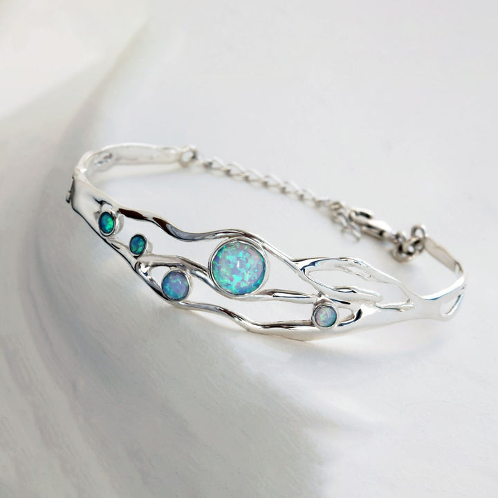 This bangle bracelet is handcrafted from Sterling Silver and is set with Opalite gemstones.