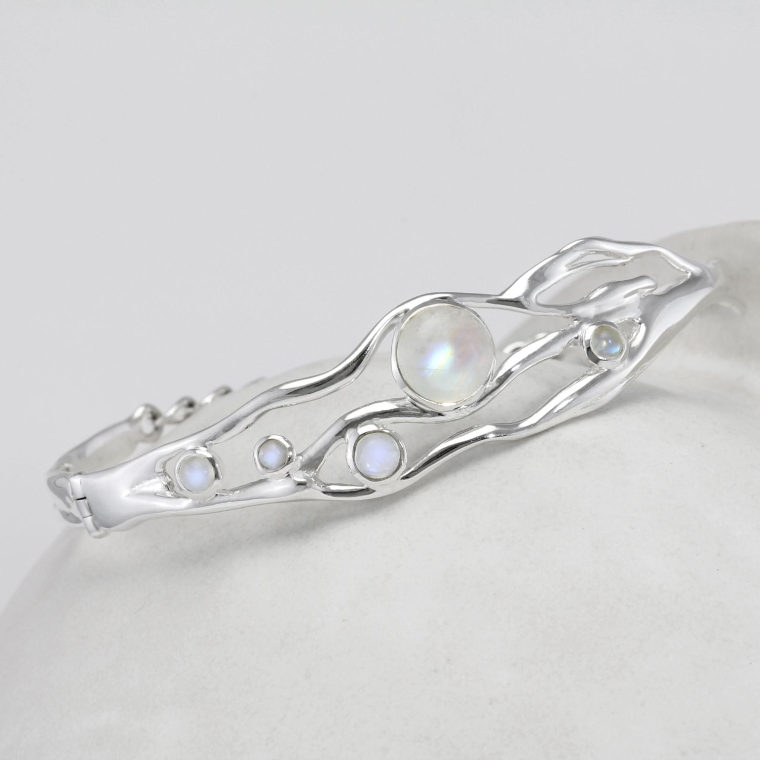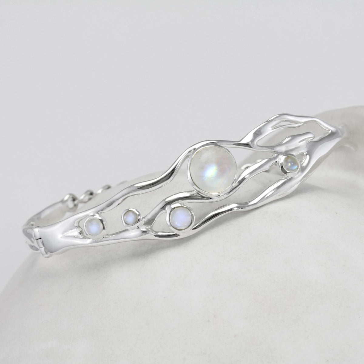 This bangle is handcrafted from solid sterling silver and is set with five moonstones.