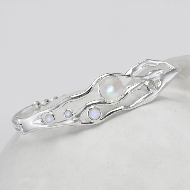 This Sterling Silver Moonstone Bangle by Isla Silver is an intricate and eye-catching piece that combines organic design with subtle beauty. Designed in Devon, this bangle features five radiant moonstones of varying sizes, dotted gracefully throughout the flowing sterling silver. The unique, handcrafted design adds a touch of understated luxury and is perfect for someone who appreciates unique and delicate details.