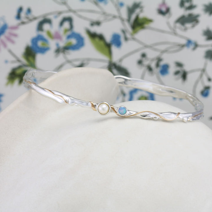 This bangle is handcrafted from sterling silver and 14KT gold fill wire, and is set with a white freshwater pearl and a smaller opalite.