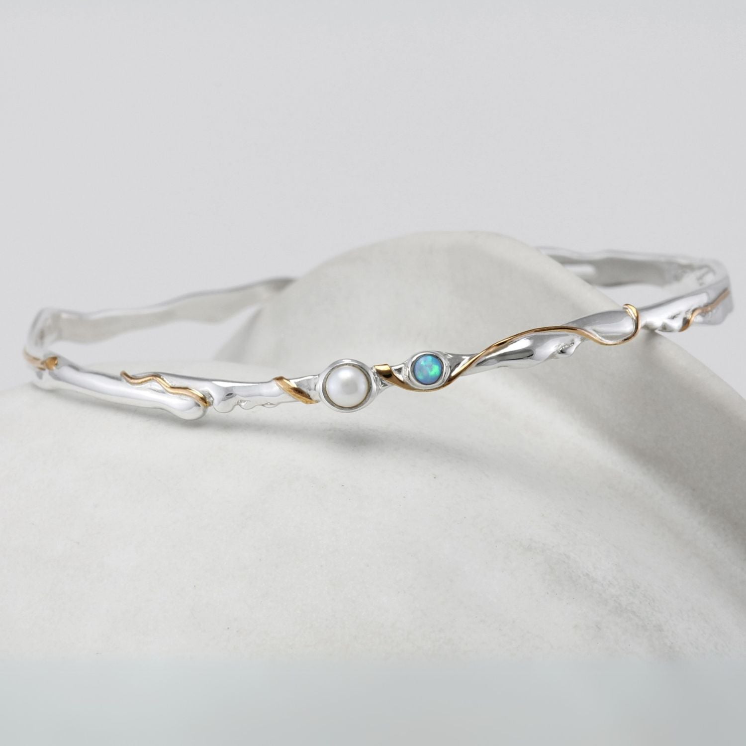 This Delicate Opal & Freshwater Pearl Bangle by Isla Silver is a beautiful and organic piece. The sterling silver bangle is entwined with 14KT gold detailing, creating a delicate and luxurious look. The white freshwater pearl and vibrant blue opal add a touch of serene beauty, making this a perfect, thoughtful gift.