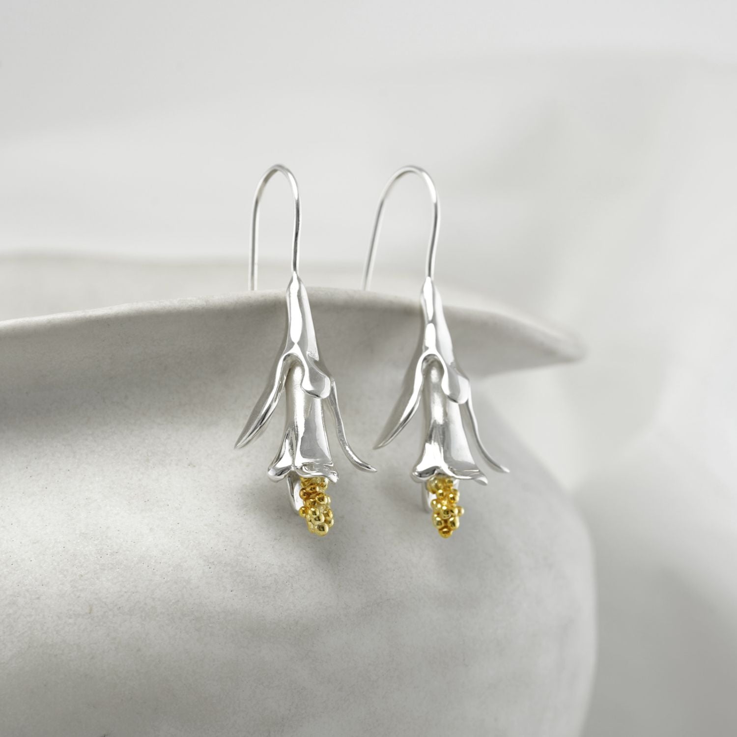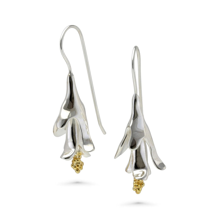 The Statement Mixed Metal Contemporary Flower Earrings by Isla Silver are a unique and eye-catching accessory. These handmade sterling silver hook drop earrings are crafted into a floral design with 18KT gold-plated centers. The mixed-metal design creates a contemporary and luxurious statement.