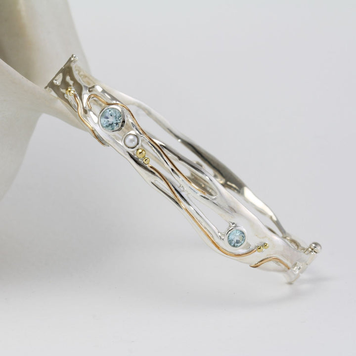 This hinged bangle is handcrafted from sterling silver. It is set with two round blue topaz gemstones and a freshwater pearl, and it is finished with 14k gold-fill wire detailing.