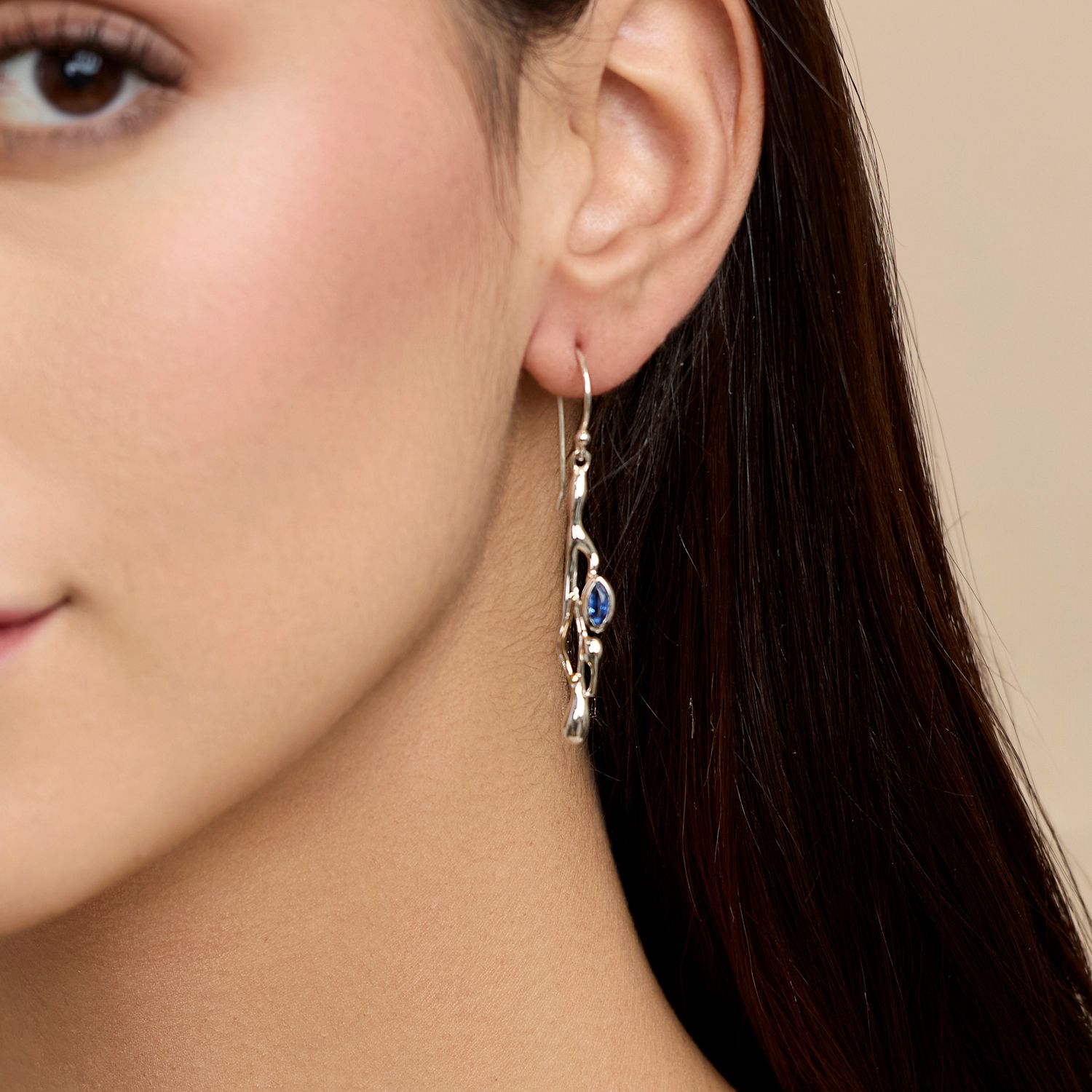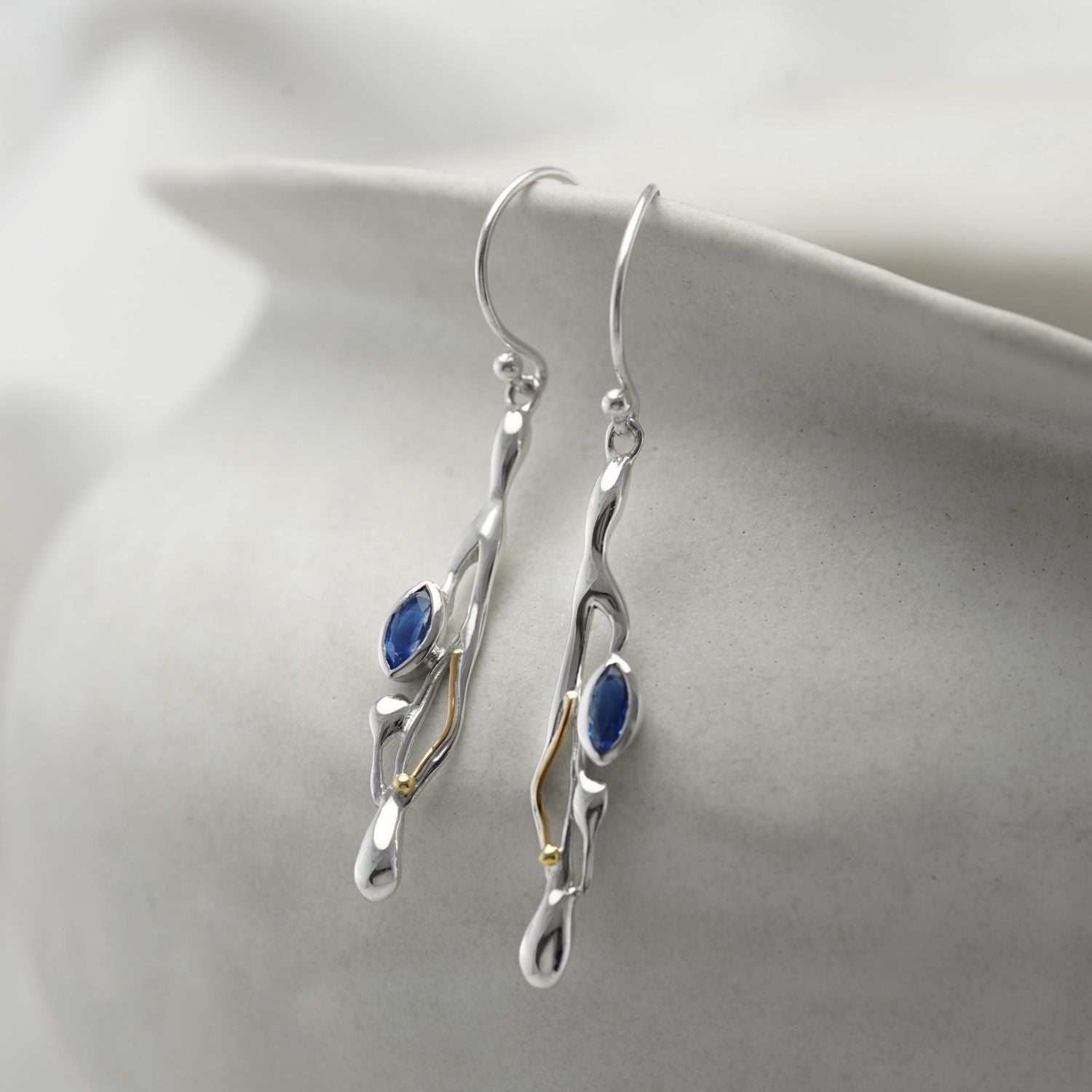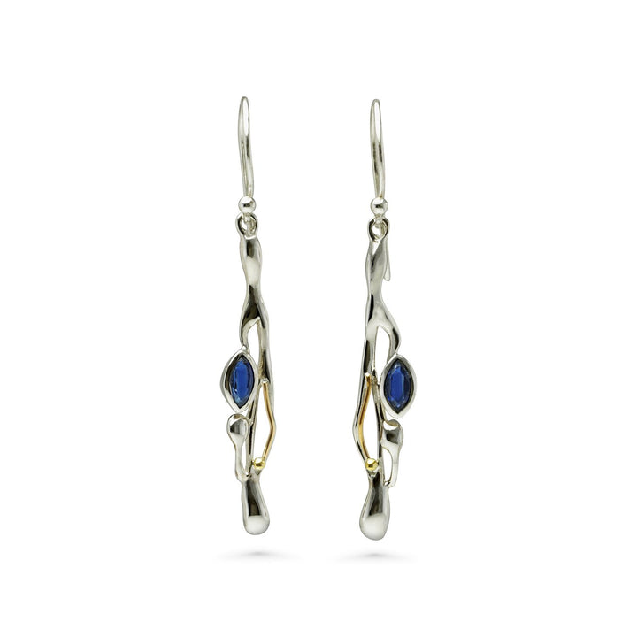 The Kyanite Drop Earrings by Isla Silver are a pair of elegant drop earrings. They feature a beautiful, faceted blue kyanite stone accented with 14KT gold details. The flowing silver formation gives them an art nouveau flair, making them a perfect everyday piece that is eye-catching and light.