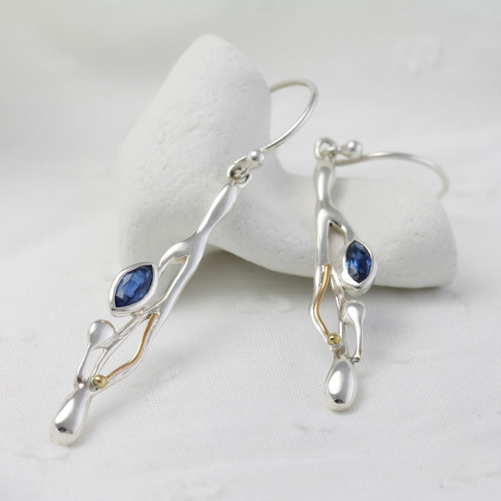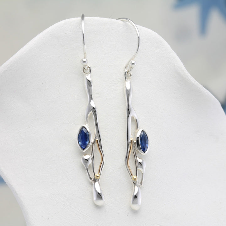 These drop earrings are made of sterling silver and feature a faceted blue kyanite and 14KT gold details.