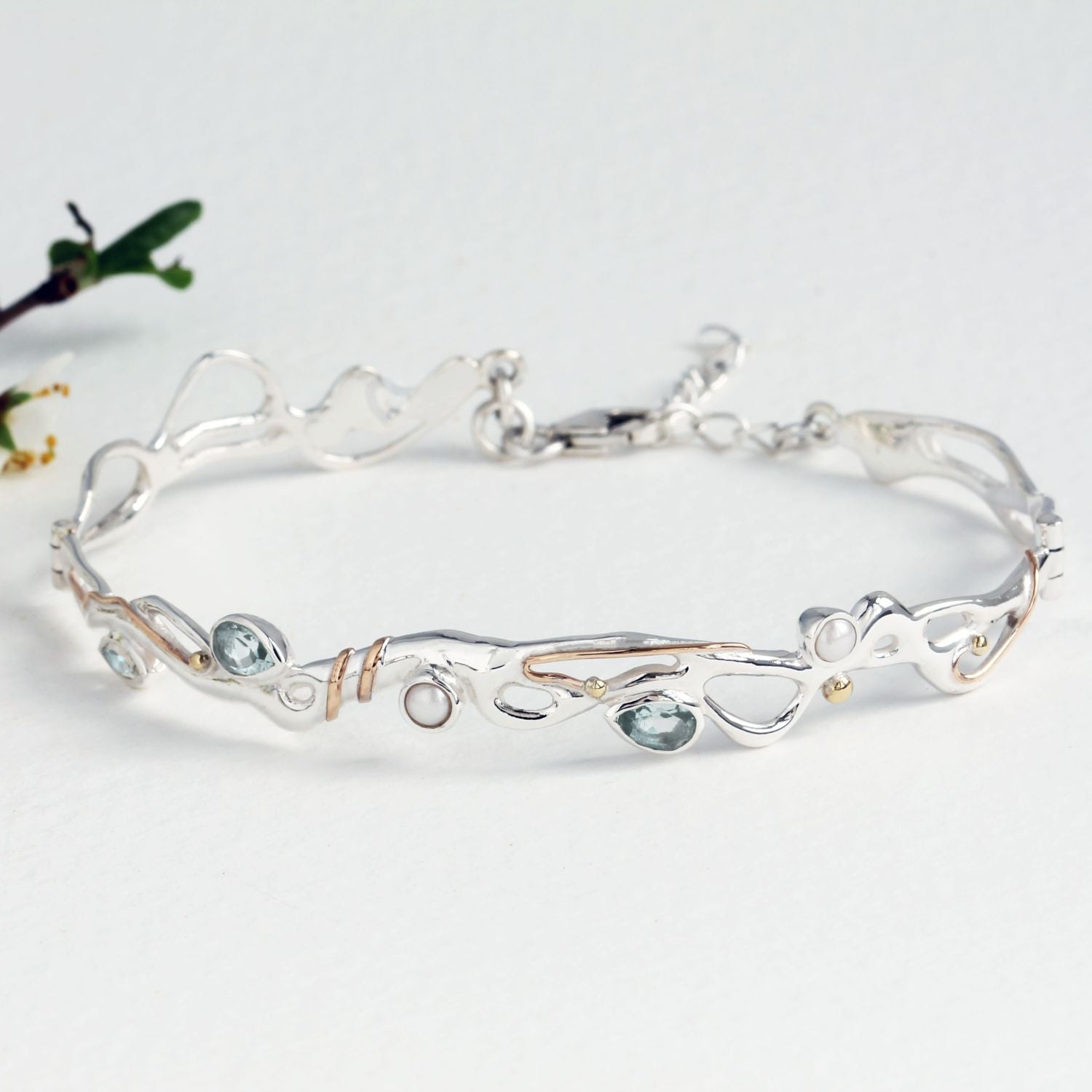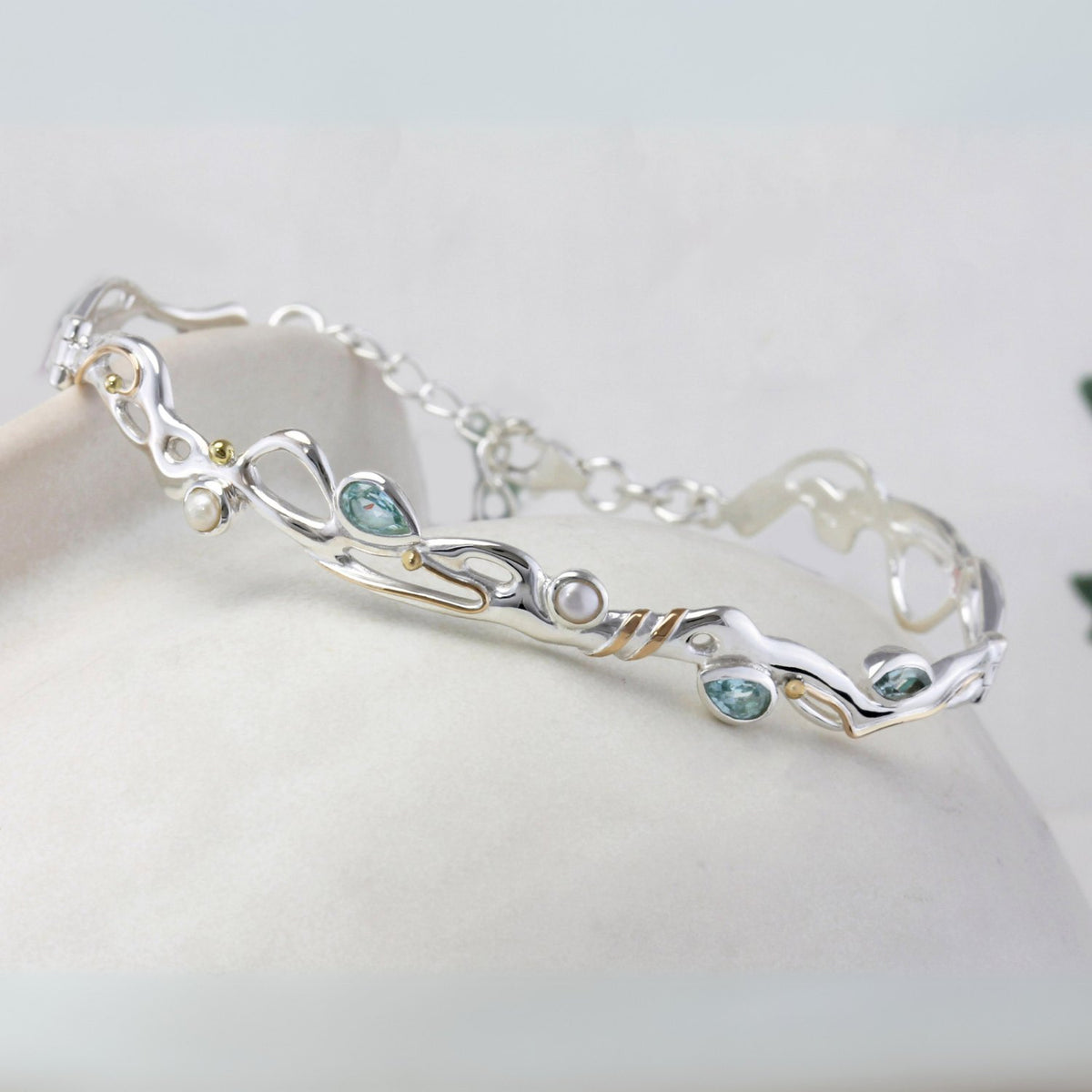 This Handmade Riviera Blue Topaz & Pearl Hinged Bracelet by Isla Silver captures the spirit of the English coastline with its luminous gems and graceful design. Blue topaz stones evoke the sparkle of the sea, while freshwater pearls bring timeless elegance. Golden accents highlight the handcrafted artistry, creating a piece that is both romantic and sophisticated. Designed in Devon, it reflects thoughtful craftsmanship and the serene beauty of nature, making it an exquisite keepsake or gift.