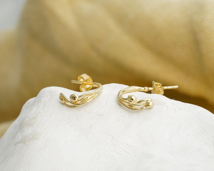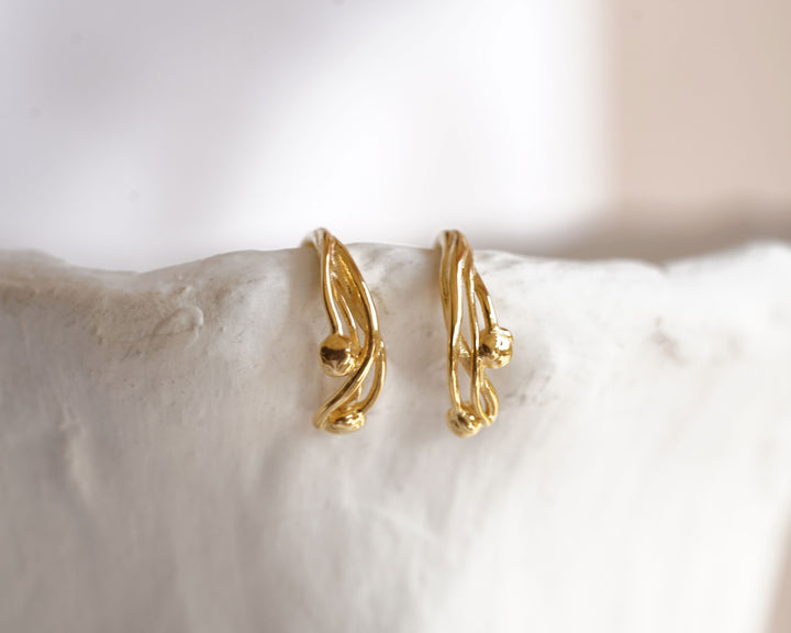 These Molten Gold Sculptural Huggie Earrings by Isla Silver are a new take on traditional hoops. Their flowing, natural, and sculptural design gives them a modern and unique aesthetic. Perfect for everyday wear, these "huggie" hoops are a staple for stacking with other favorite earrings. They are a celebration of natural form and subtle elegance, adding a touch of sophisticated luxury to any look.