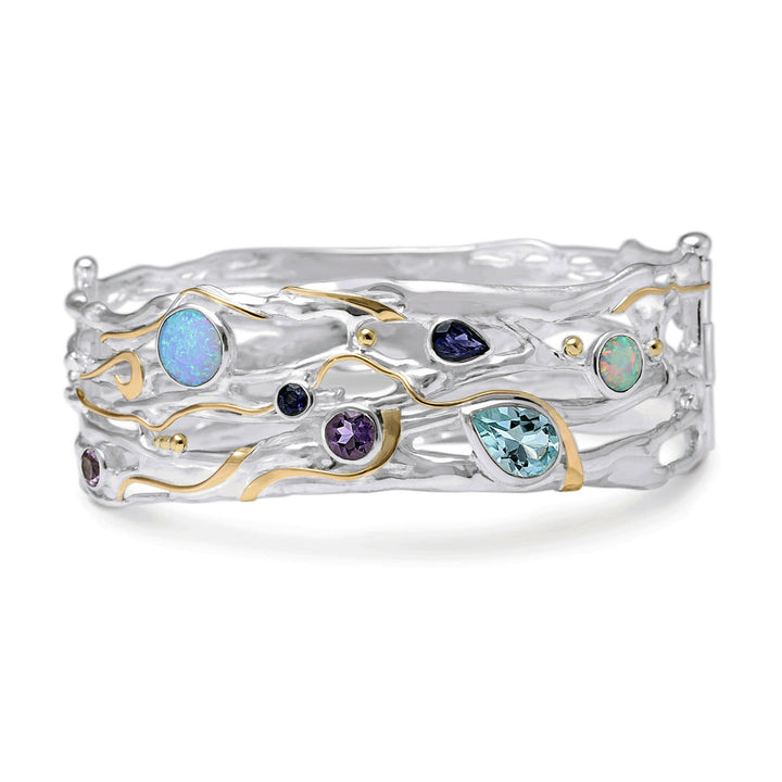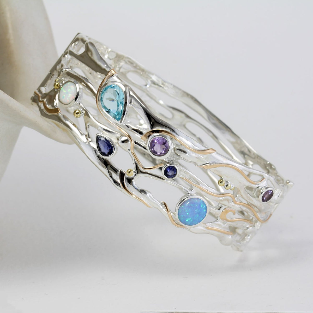 This bangle is made of Sterling Silver and is entwined with 14KT Gold detailing. It is set with Opalites, Amethysts, Blue Topaz, and Iolites.
