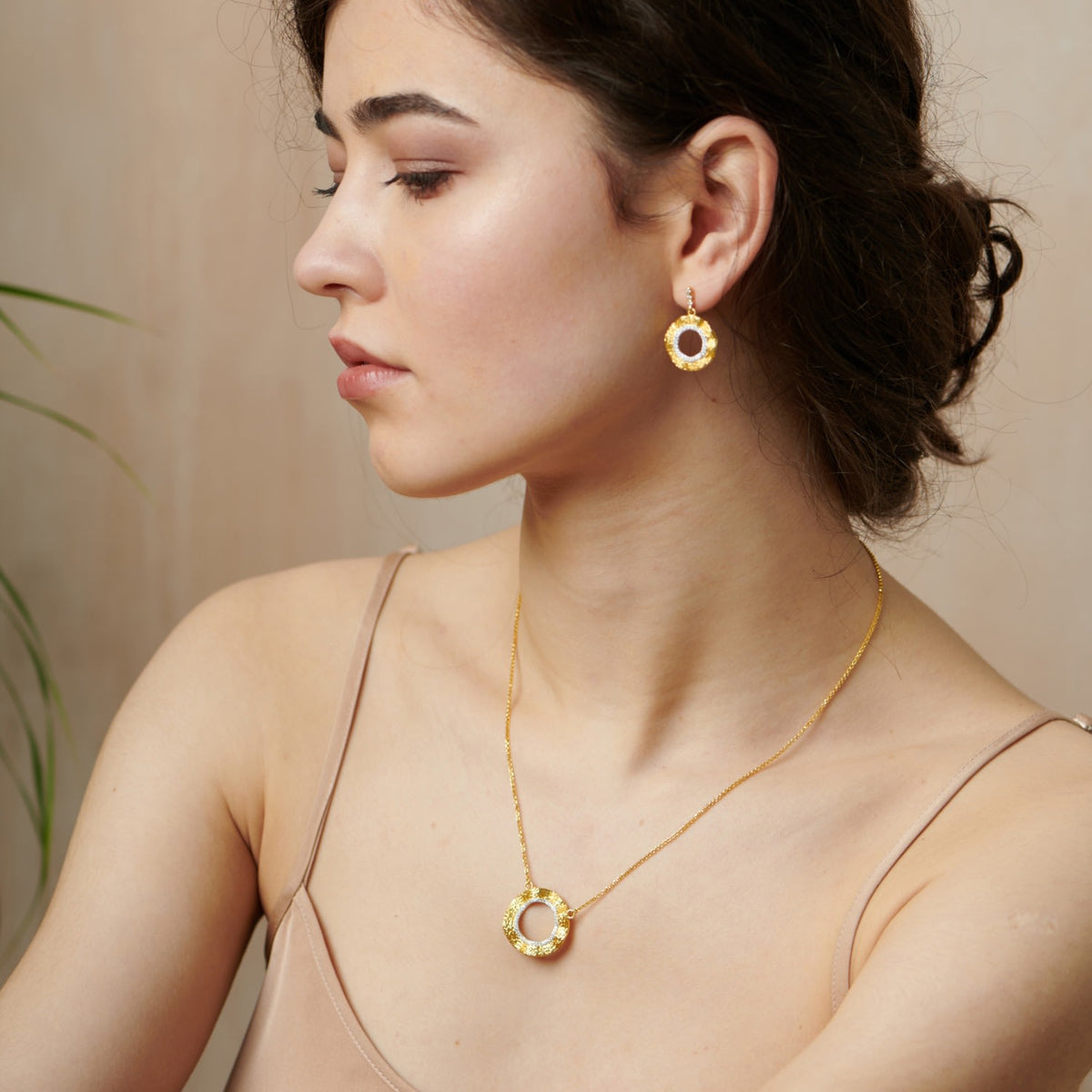 These Shen Gold Vermeil Mixed Tone Circle Textured Earrings by Janus Edinburgh are inspired by the Ancient Egyptian Shen symbol, which represents eternity and protection. These stunning circular gold earrings are intricately textured and studded with cubic zirconia, infusing you with a sense of beauty and security. They are the perfect go-to set for adding a touch of meaningful elegance to your look.