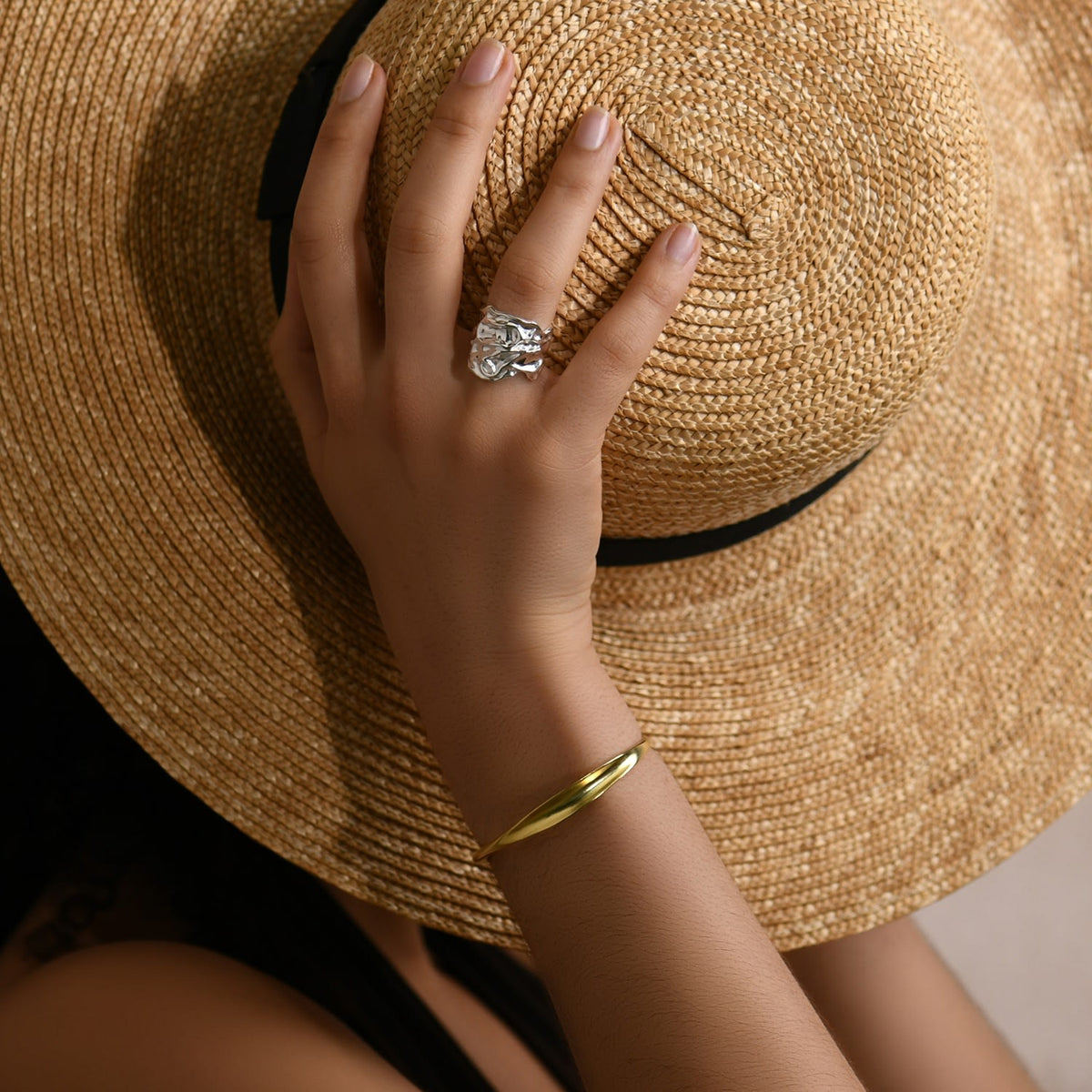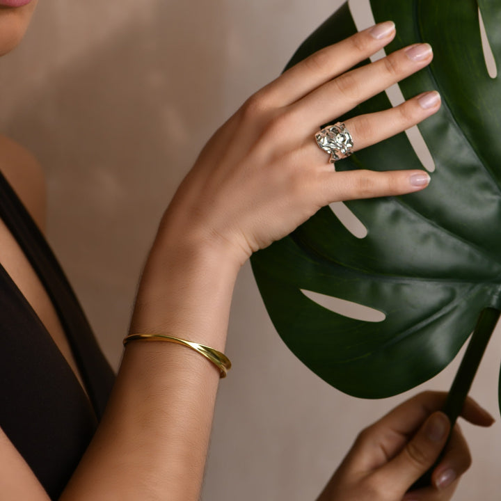 The Gold Vermeil Sannox Slim Thin Smooth Bangle by Janus Edinburgh is a gorgeous, minimal bangle inspired by the Sannox river on the Isle of Arran. This slim, sweeping piece curves elegantly around the wrist, with a wing-like design that mimics the gentle movement of a river.