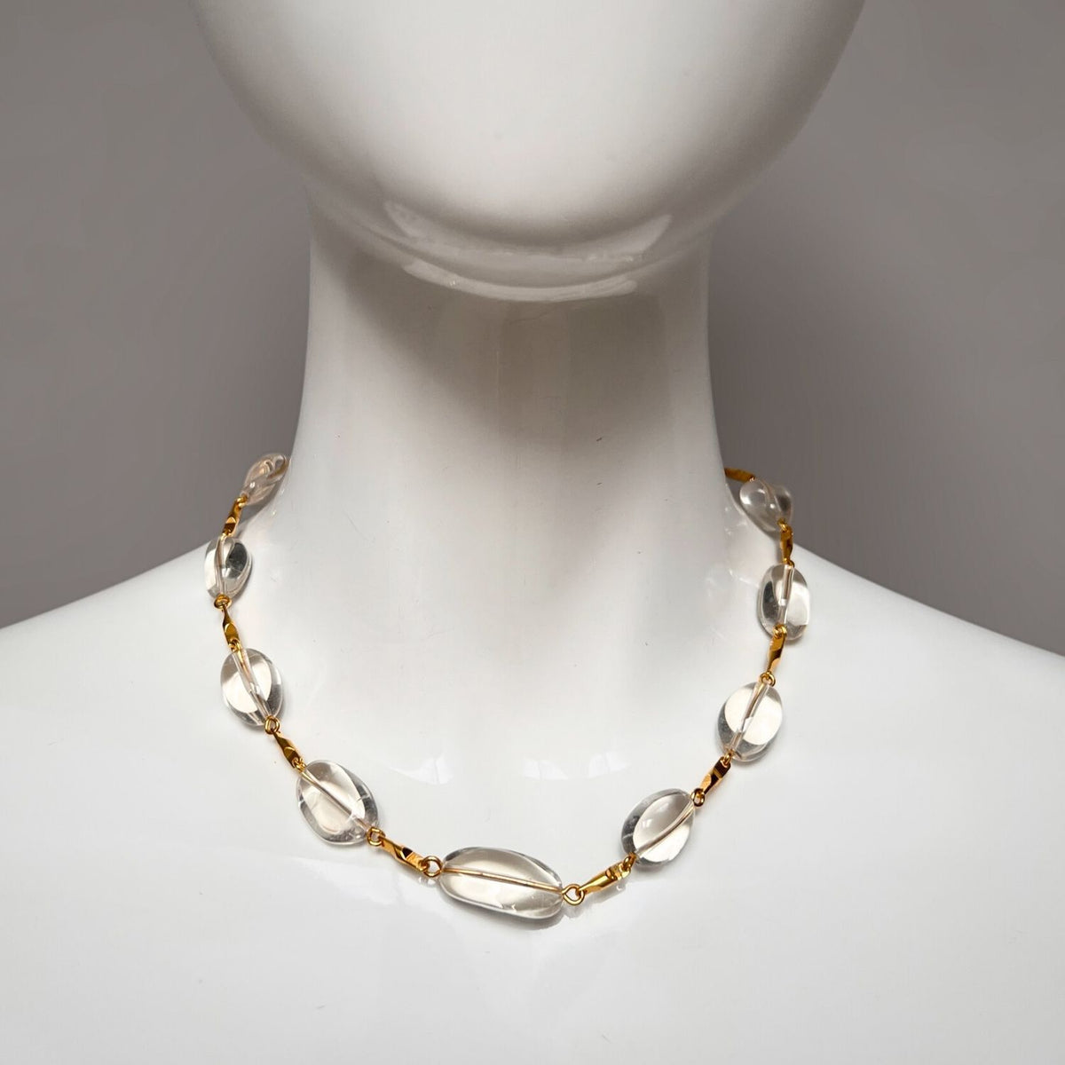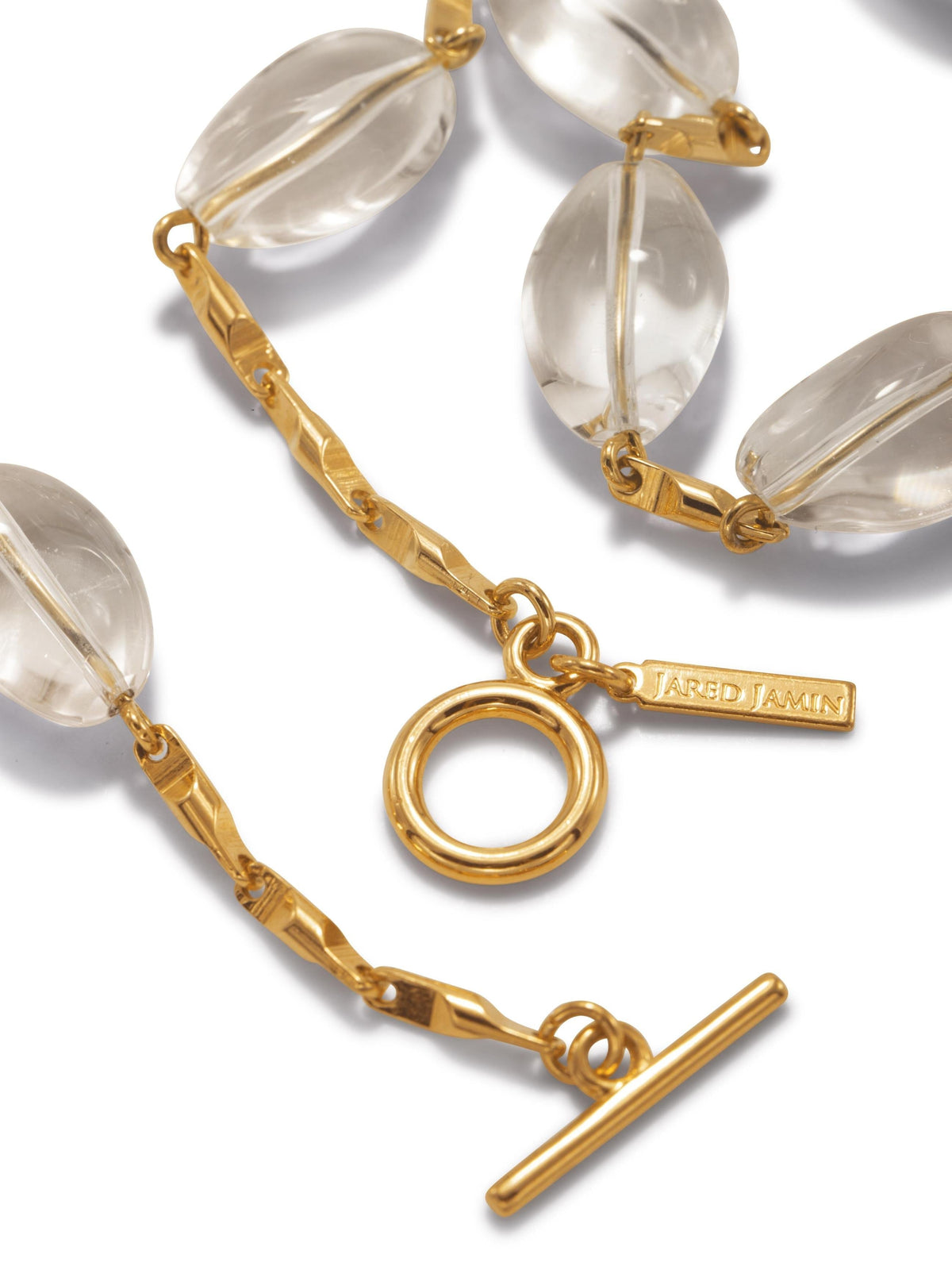 This necklace is an 18-inch gold-plated bar-chain with crystal quartz beads and a gold-plated toggle clasp.