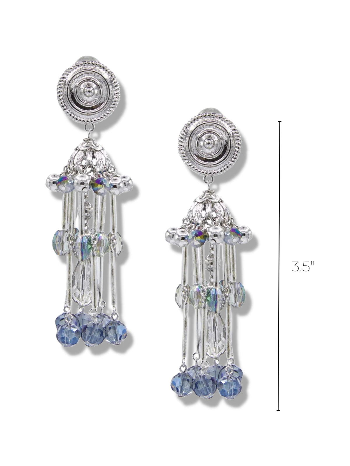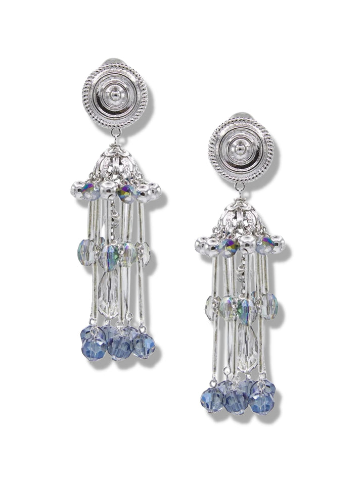 These clip-on earrings are made with faceted iridescent crystals and silver-plated components. They have a clip-on fastening and a drop of 4.25".