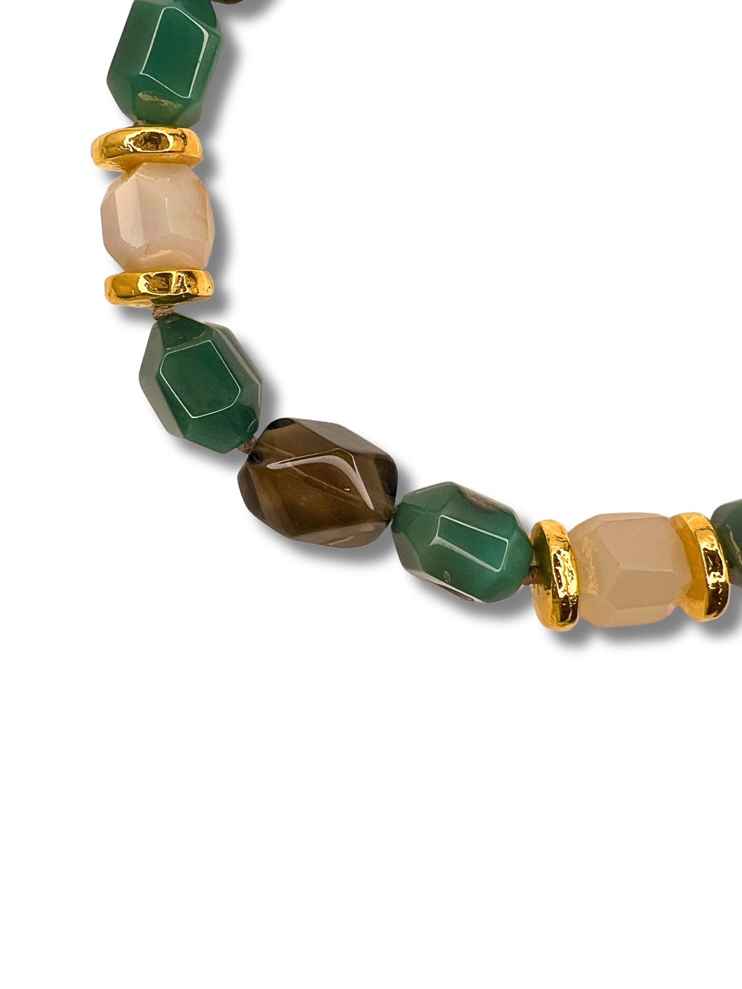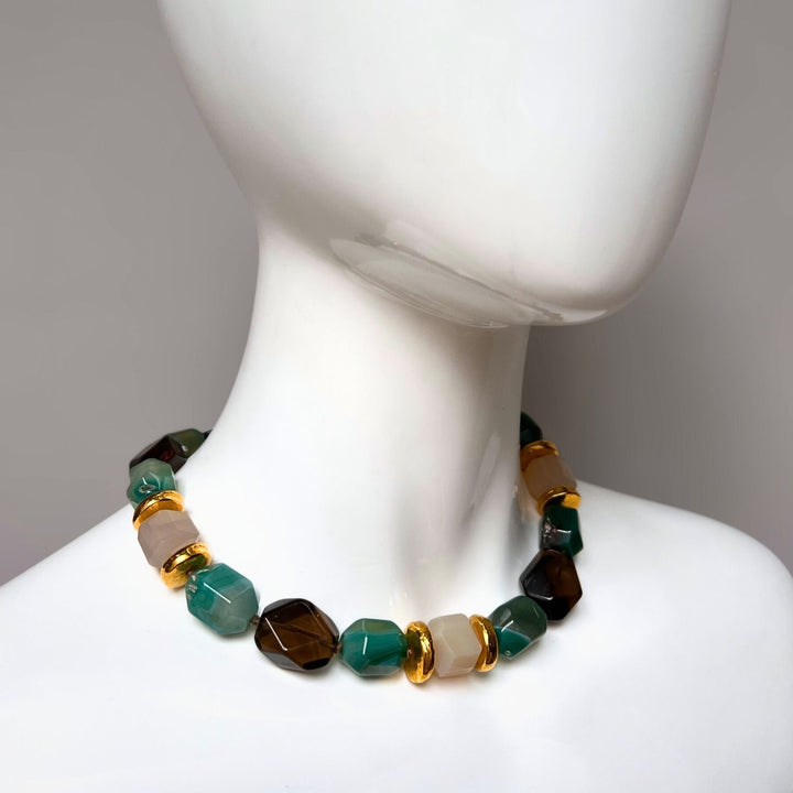 This beaded necklace is made of layers of chunky pebble-shaped green agate, quartz, 18K plated disc beads, and smokey clear quartz stone beads. It is finished with an 18K plated spring ring clasp.