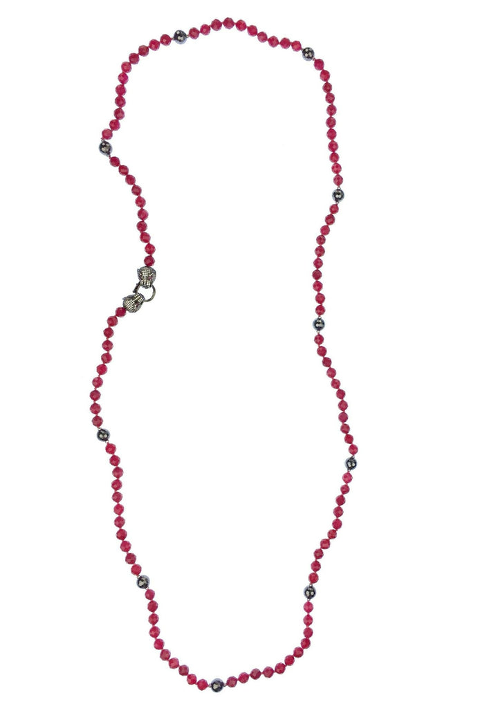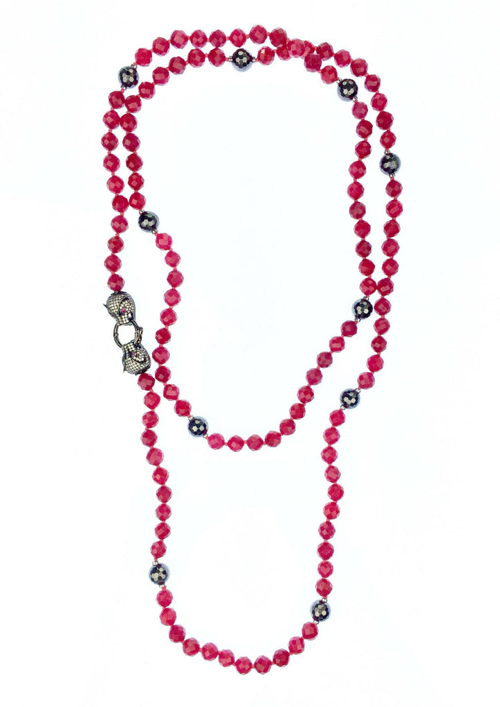 This beaded necklace features hand-knotted faceted quartz, plated hematite, and hematite gemstone beads. It is 46 inches long and has a panther motif Cz pave clasp.