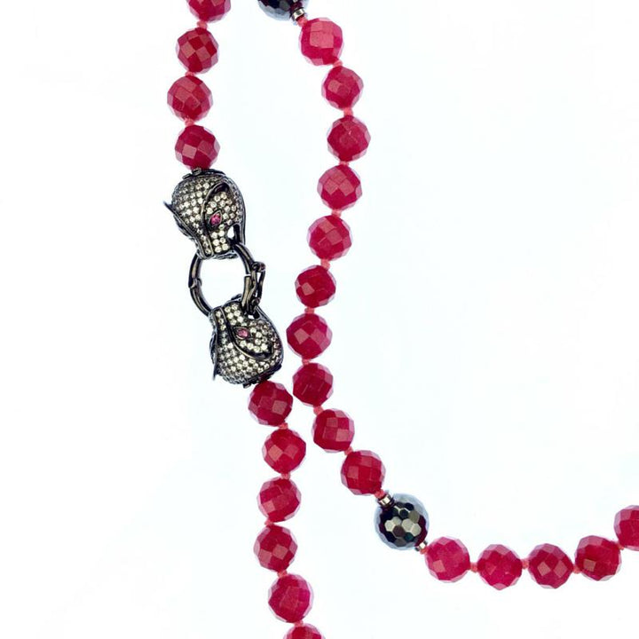 This Prying Panthers Necklace by Jaredjamin is a stunning beaded necklace. It features hand-knotted faceted quartz, plated hematite, and hematite gemstone beads, elegantly finished with a sparkling panther motif Cz pave clasp. It measures 46 inches in length, making a striking and refined statement piece.