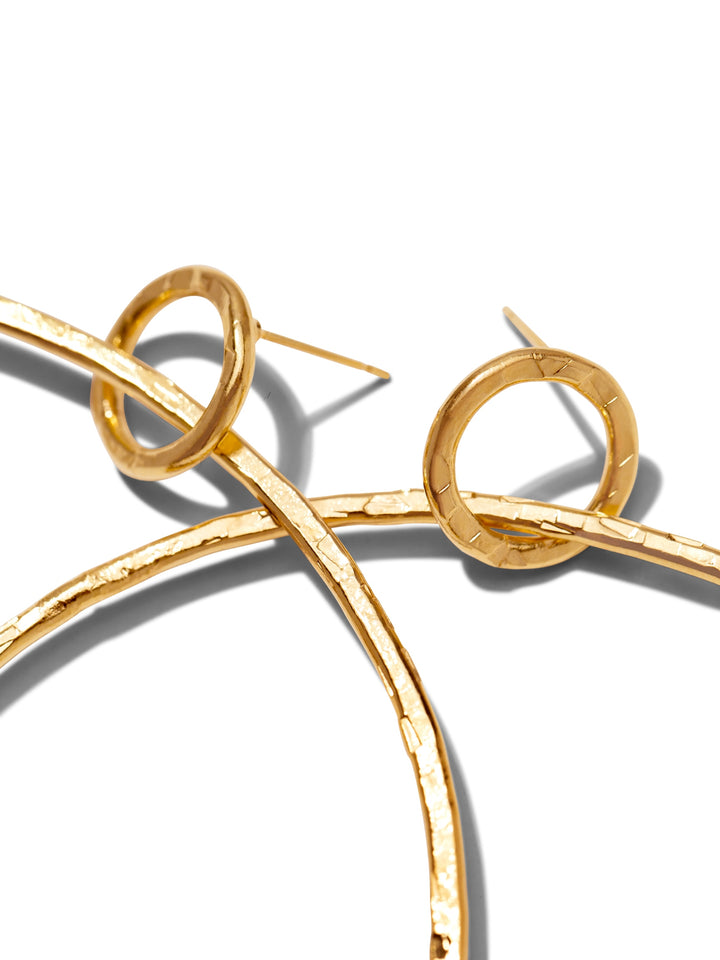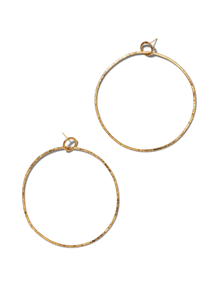 These large hoop earrings are made of 18K gold and have a textured design. They have a 4-inch drop.