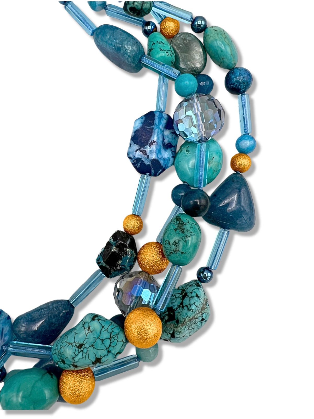 This necklace is made with Turquoise, Jasper, Agate, Quartz, Crystals, Howlite, and 18-karat Stardust beads. It has a lobster clasp and a 2-inch extension.