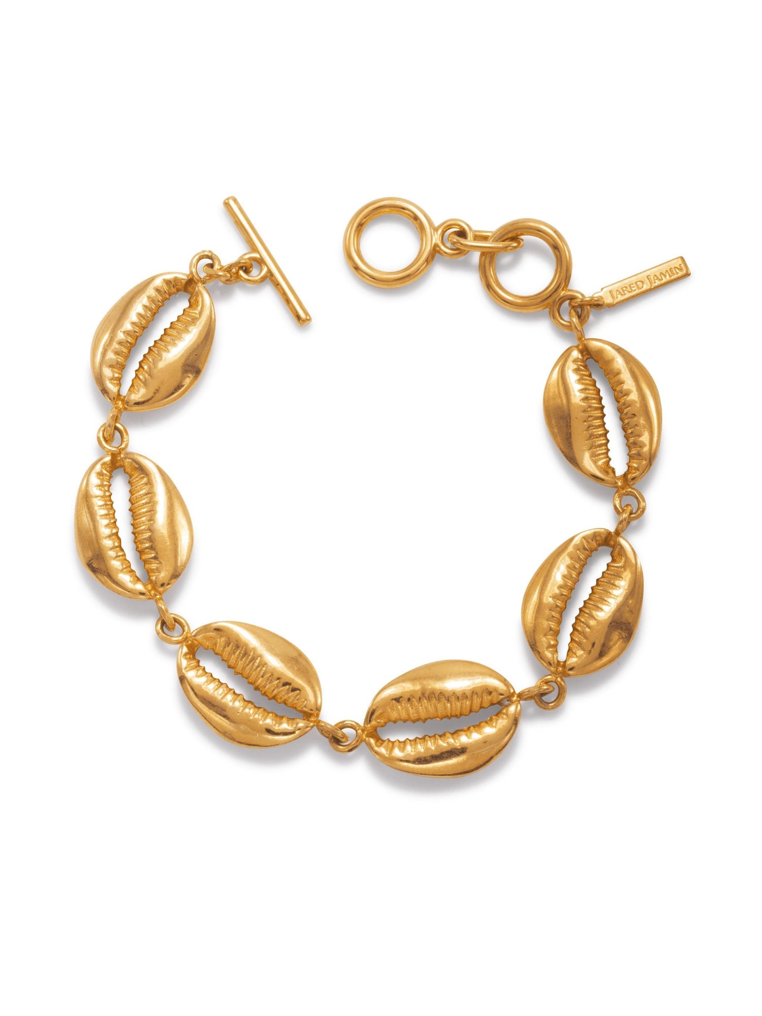 This Gold Bel Mare Cowrie Seashell Bracelet by Jaredjamin is a beautiful and elegant piece. The cowrie seashell, one of the sea's great gifts, is set in a luscious 18-karat gold plate. The toggle clasp ensures it stays safe and secure. It's a perfect accessory for those who love the tides and the sea.