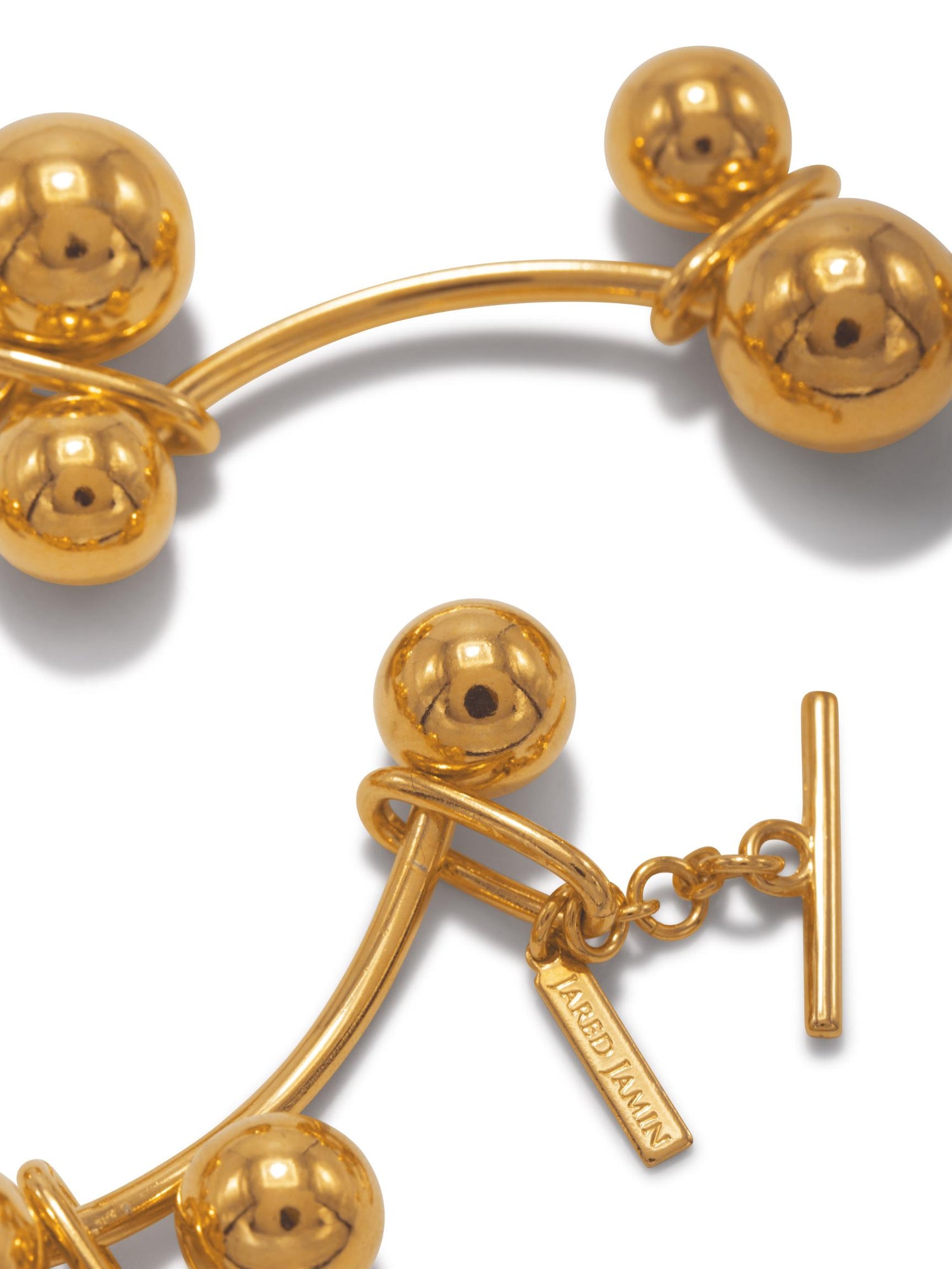This Gold Orbita Nova Link Bracelet by Jaredjamin is a playful and elegant piece. It features an 18-karat gold plating over brass with curved segments adorned with spheres and interconnected by oval links. The toggle clasp and extension allow for adjustable length, making it a versatile accessory.